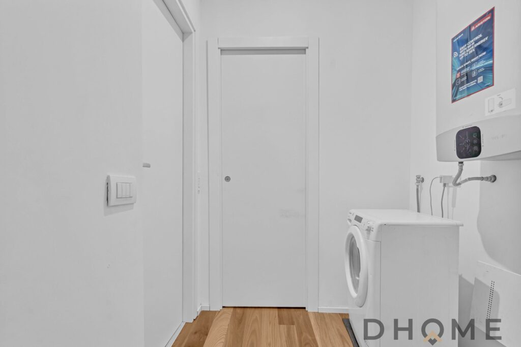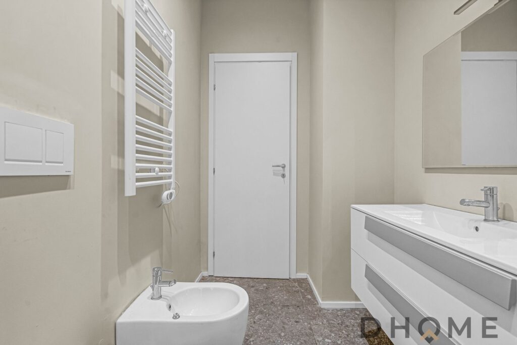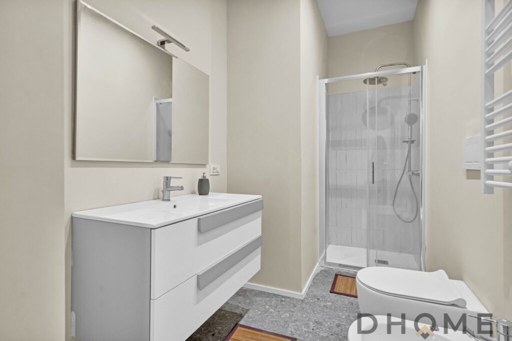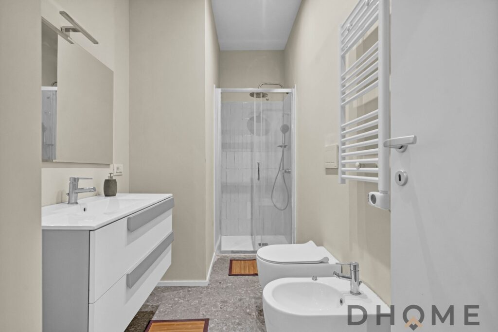 Il bagno, moderno e completamente rinnovato, è dotato di una spaziosa doccia; la lavatrice si trova comodamente nel disimpegno, così da mantenere ordine e funzionalità negli ambienti.