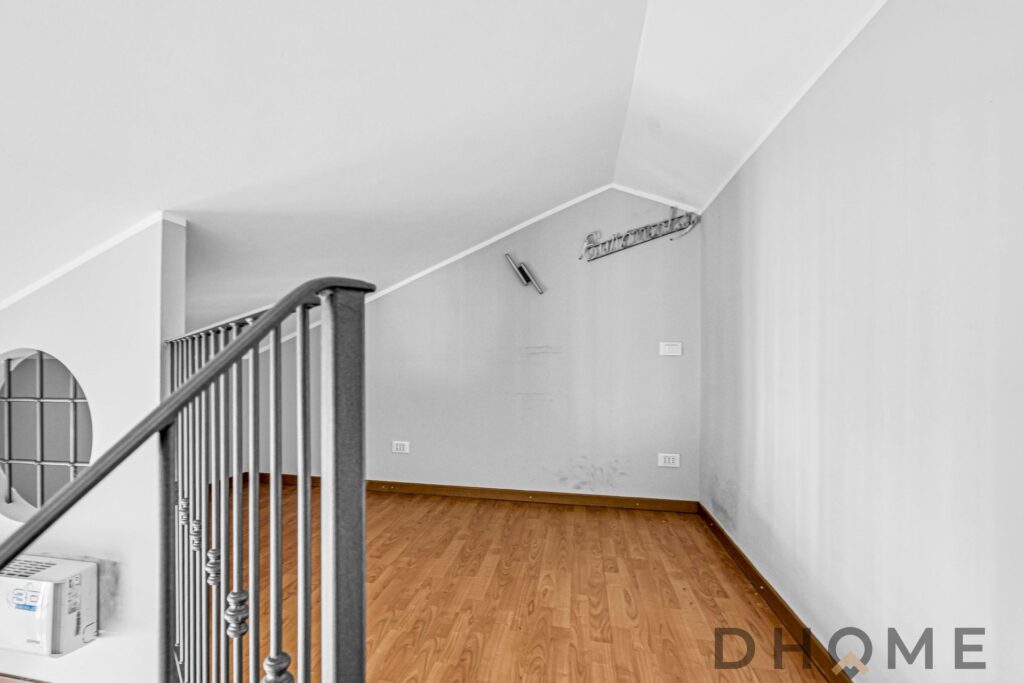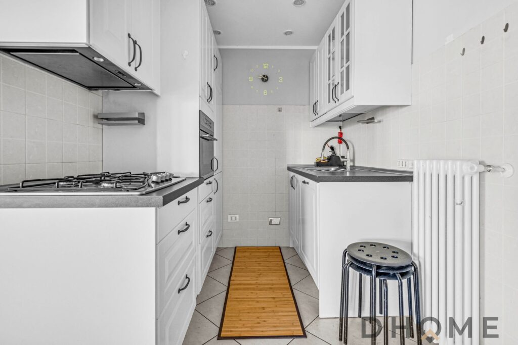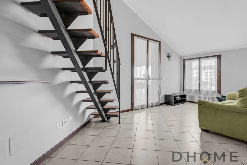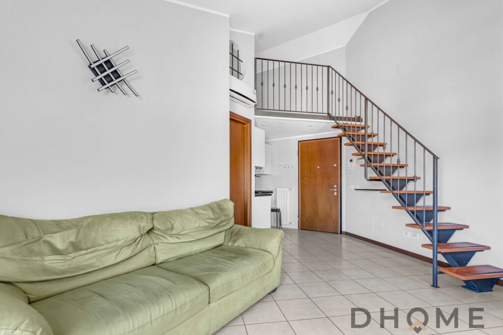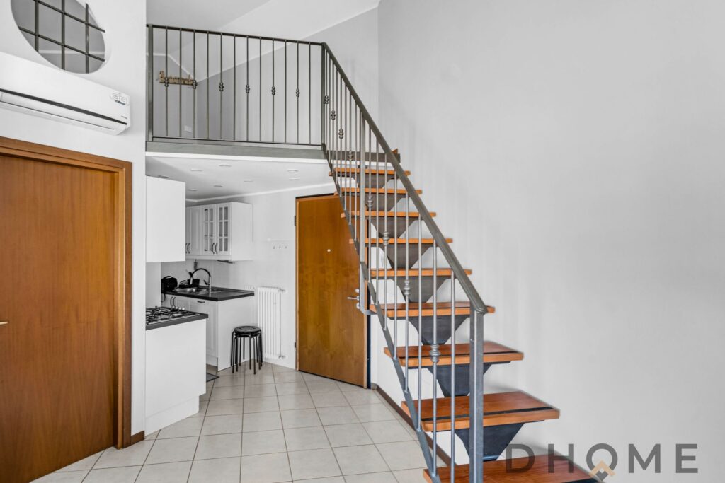 L’angolo cottura, realizzato su misura, si integra perfettamente nello spazio. Una scala interna conduce a un soppalco, ideale come studio o area relax.