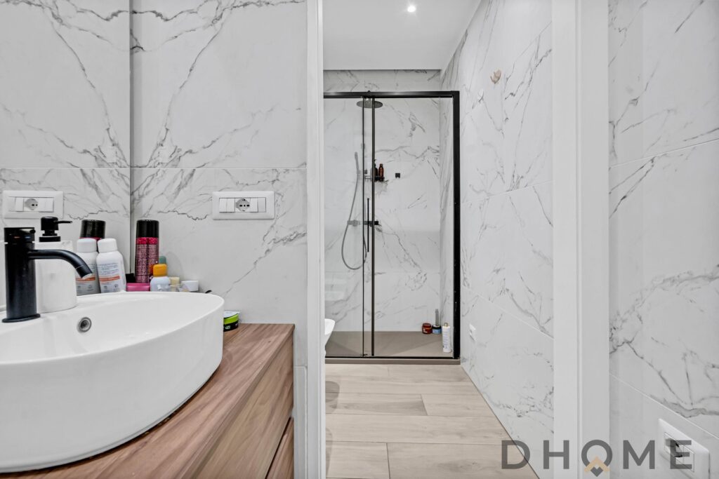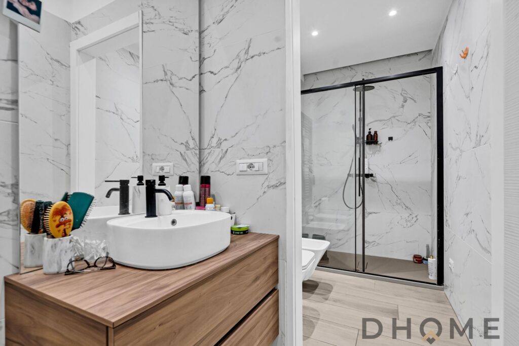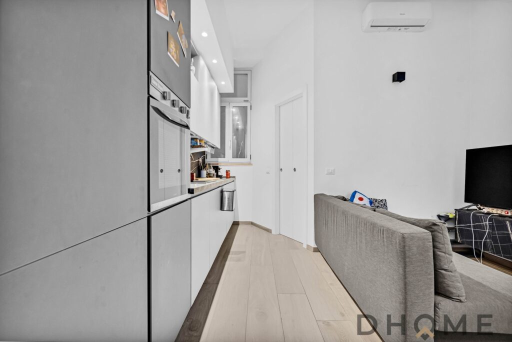 L’immobile è cosi composto: Ingresso in disimpegno, zona giorno con cucina a vista rivestita in gres effetto marmo Marquina, completa di tutti gli elettrodomestici, tavolo e mobile Tv che riprendono il motivo della cucina e divano/letto alla francese. Il bagno finestrato è dotato di Lavatrice Samsung, Boiler di 80l, sanitari sospesi, box doccia con gole di luce ed un ampio ripostiglio in quota.