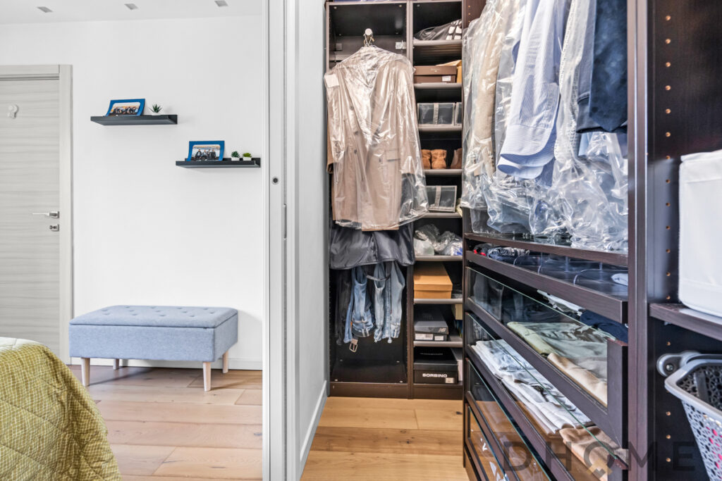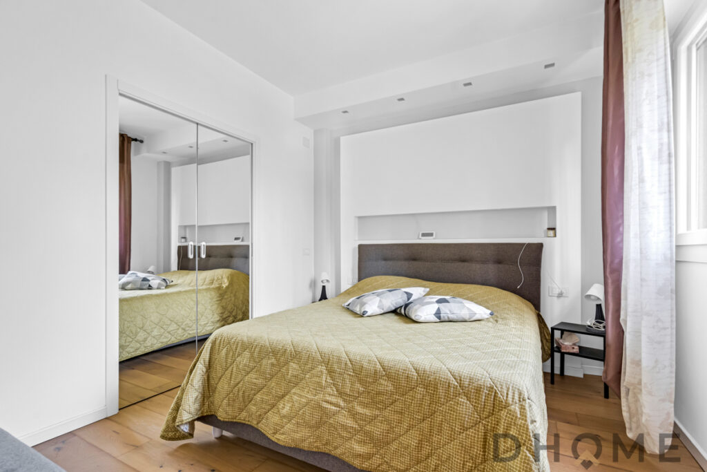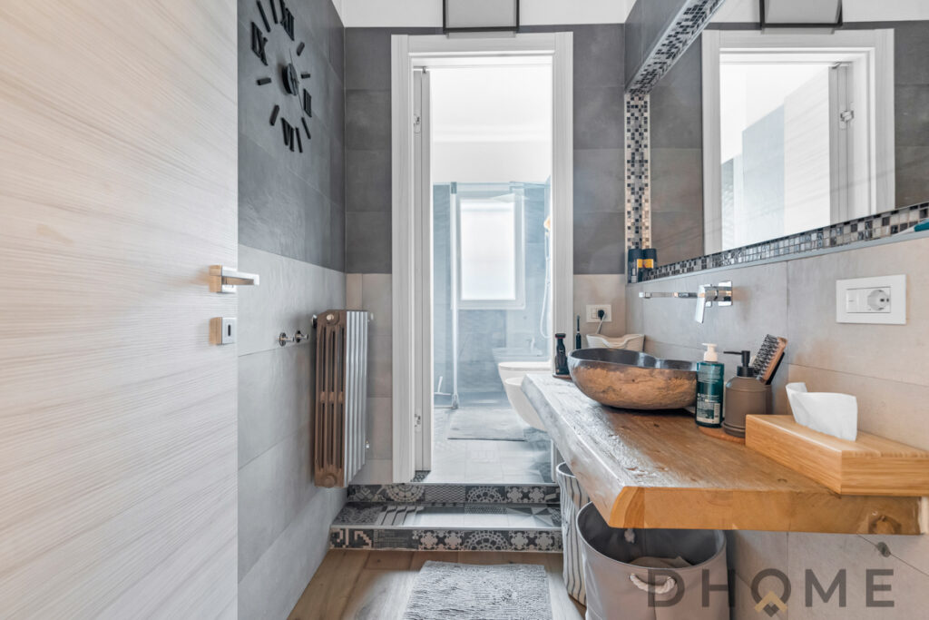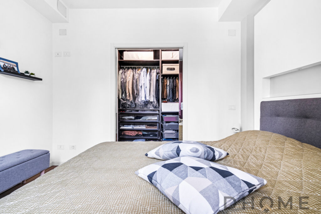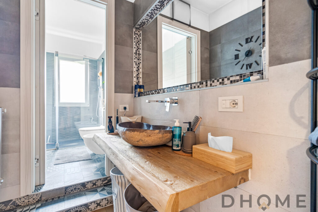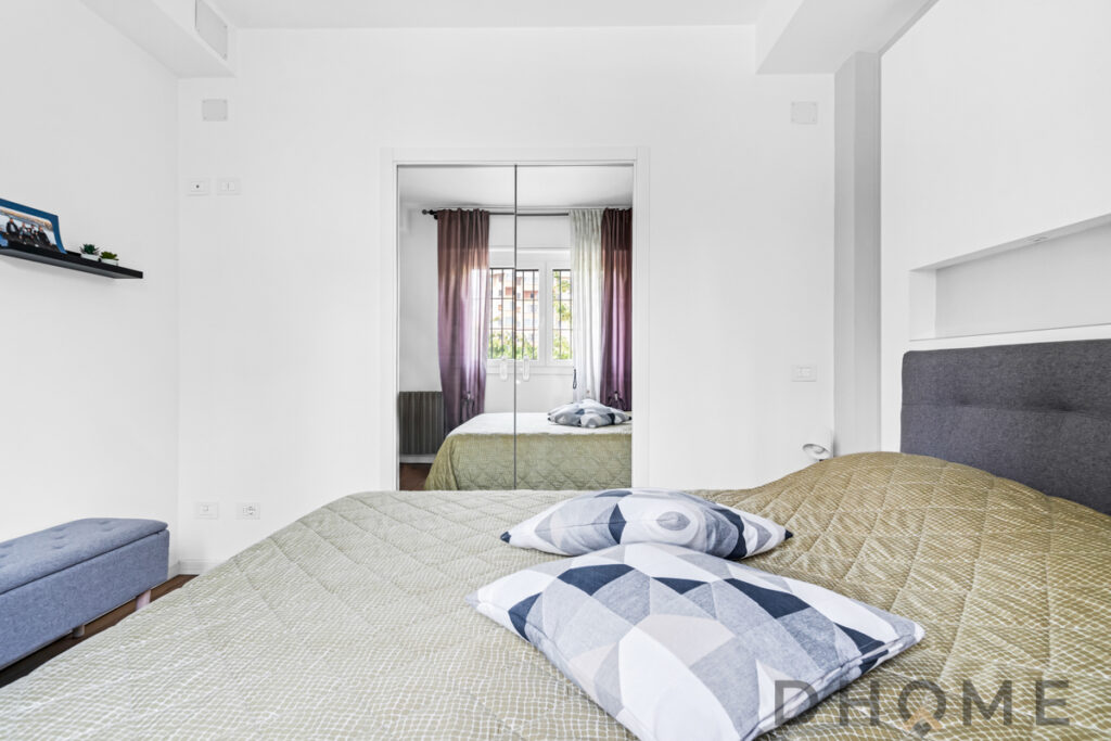 La zona notte comprende una spaziosa camera matrimoniale e, adiacente a questa, una cabina armadio indipendente, dalla quale è possibile accedere direttamente al bagno finestrato, fruibile anche dal disimpegno d’ingresso. Il bagno è rifinito con gusto e attenzione ai dettagli: è dotato di box doccia, lavabo in legno massello, sanitari sospesi e rivestimenti in gres porcellanato decorativo.