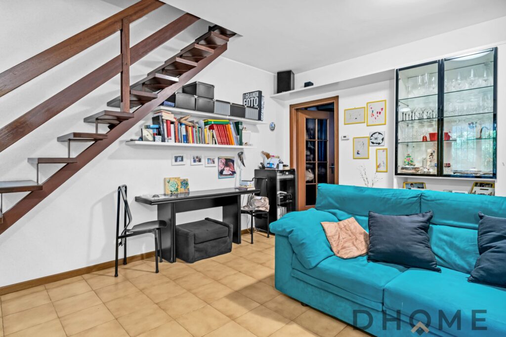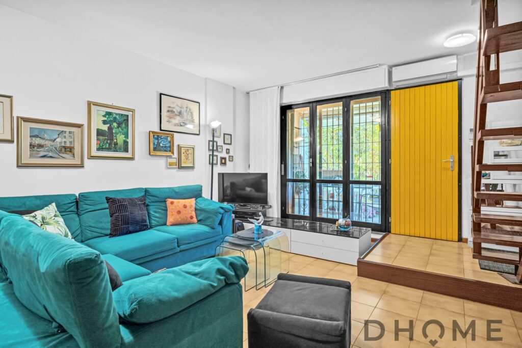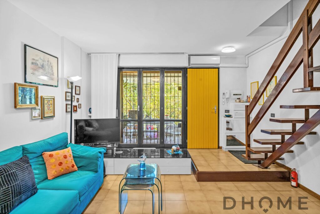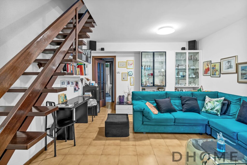 Entrando troviamo un luminoso soggiorno, da cui si accede, tramite una scala interna, al piano superiore. Sullo stesso livello si trovano anche una cucina abitabile con balcone interno e un bagno di servizio.