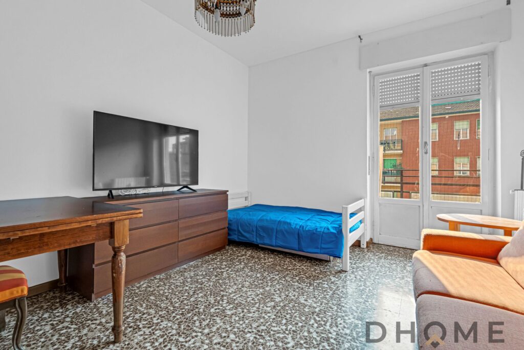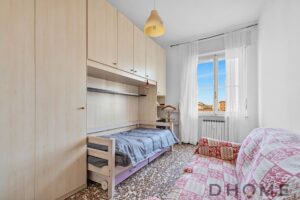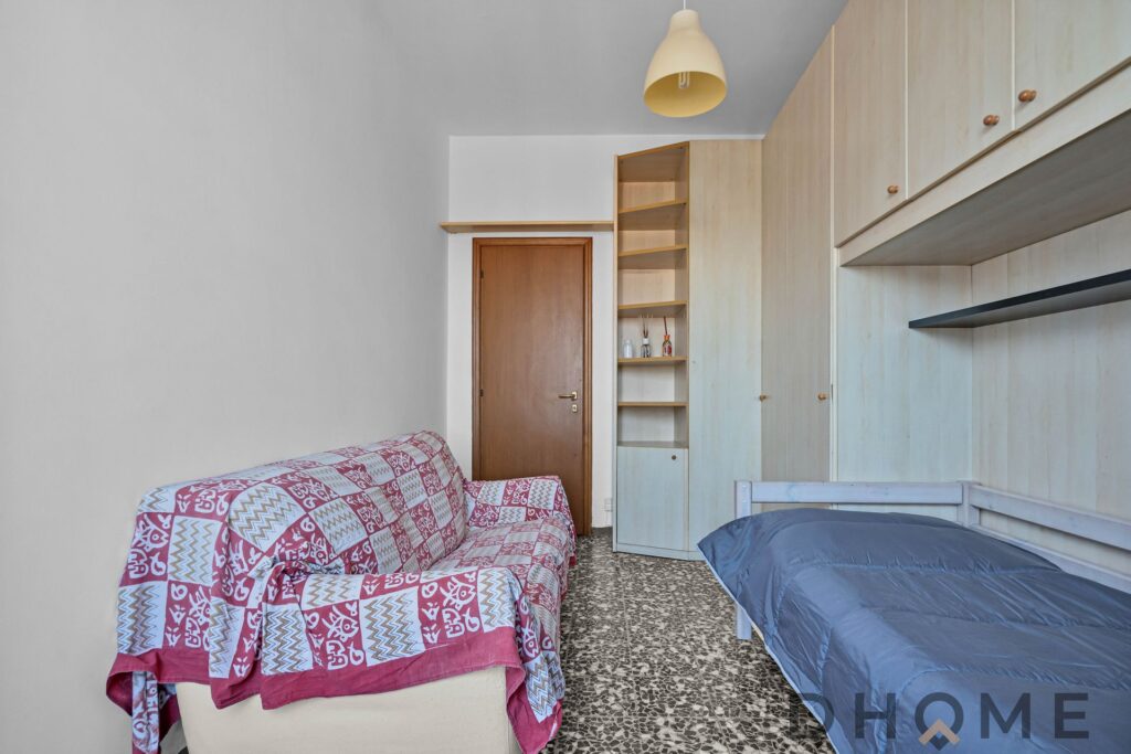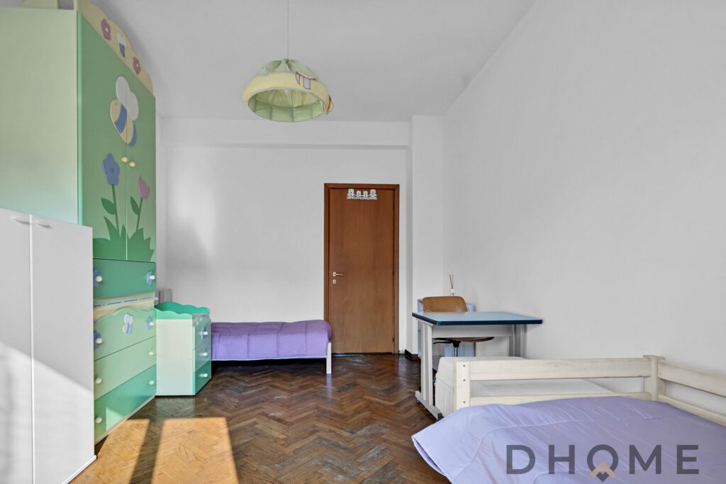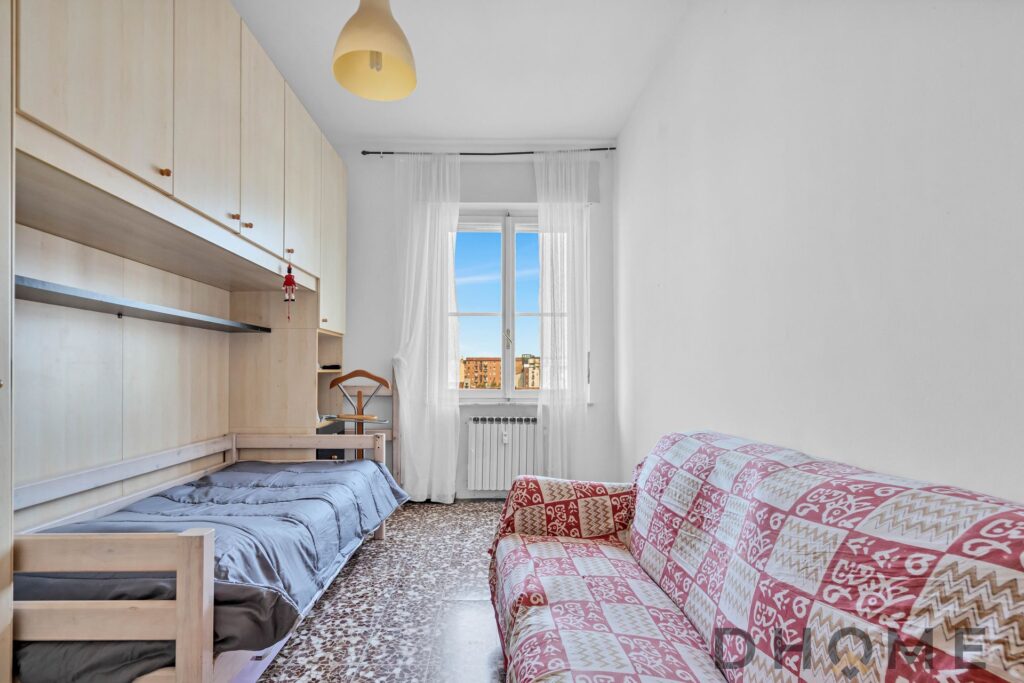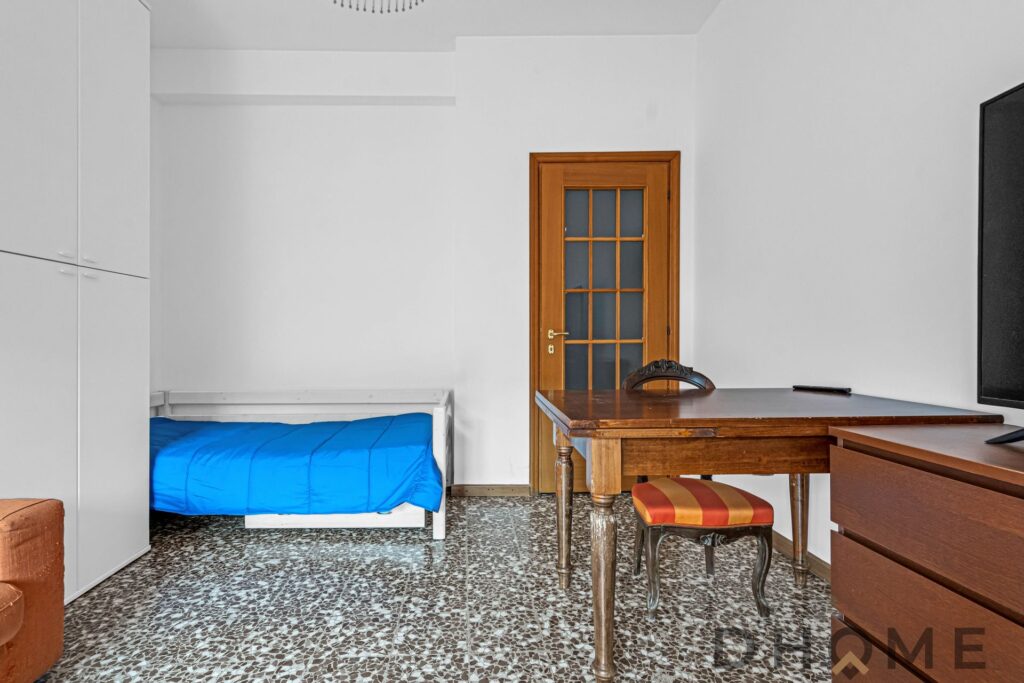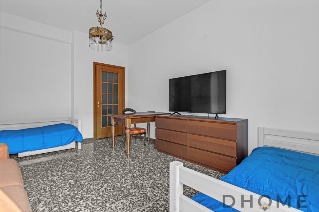 Appartamento di 90mq, sito al 7° piano (di 8) di uno stabile dotato di portineria cosi composto: ingresso in disimpegno; 2 camere da letto di 19 mq con due letti singoli suscettibili di occupazione singola o doppia; camera ad uso singolo di 12 mq; cucina semi abitabile e bagno finestrato con doppio lavello, due balconi; in fase d’installazione nuovi infissi.