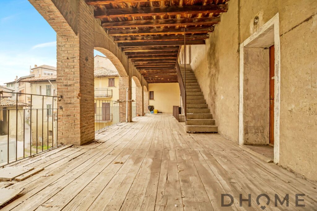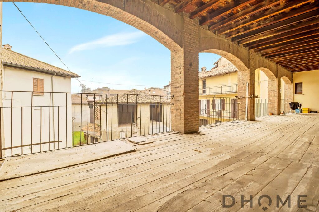 Uno degli elementi più caratteristici della proprietà è il grande loggiato coperto con archi in mattoni a vista, uno spazio suggestivo che può diventare una piacevole zona relax o conviviale, ideale per godersi la tranquillità del contesto di corte.
