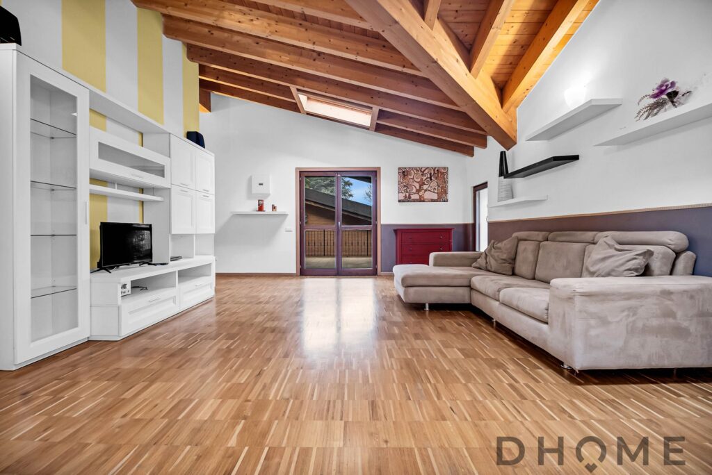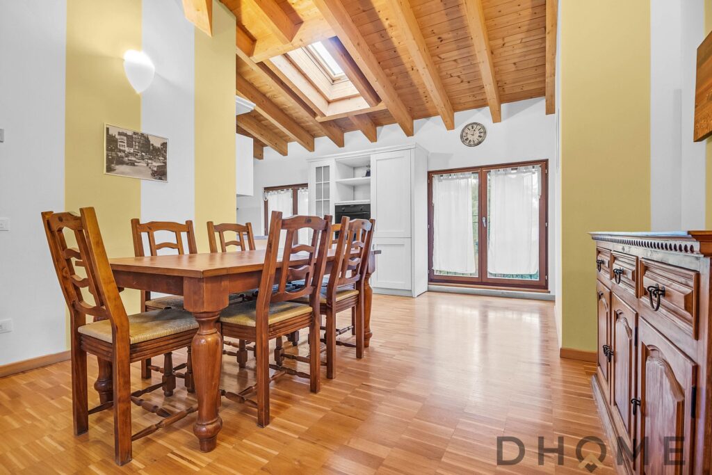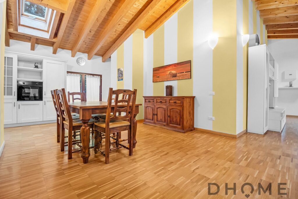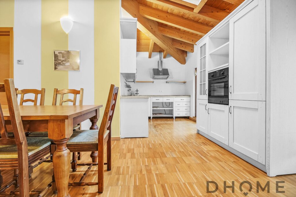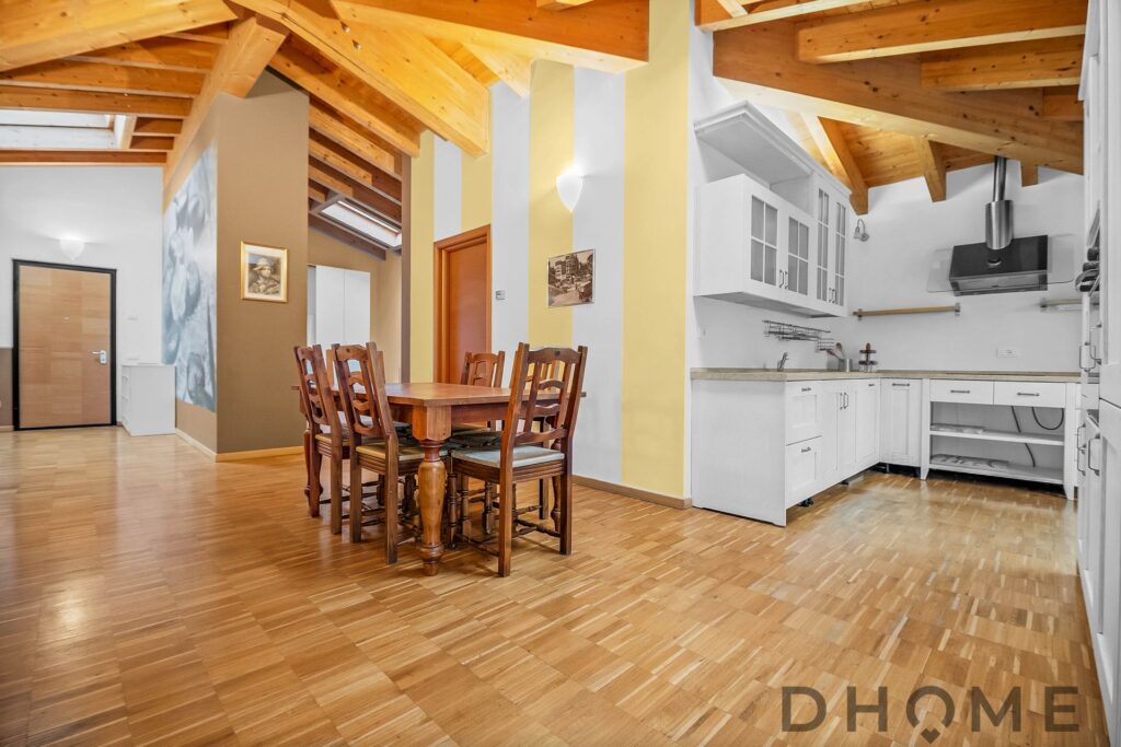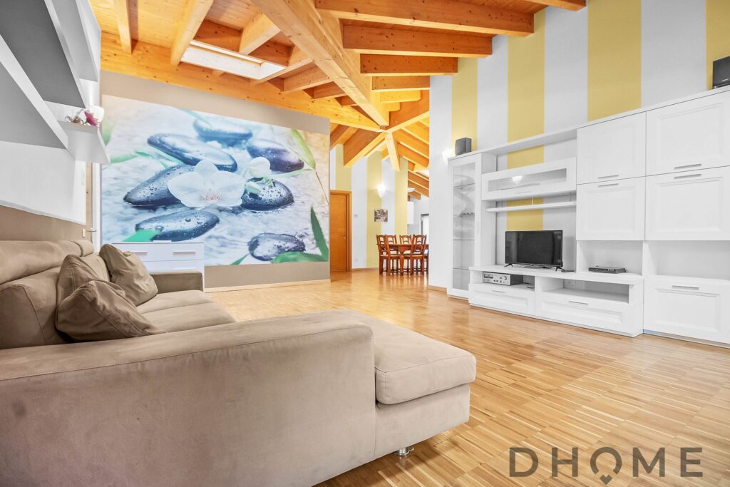 L’appartamento, un trilocale di ampia metratura (143 mq) facilmente adattabile a quadrilocale, si distingue per spazi generosi, luminosità e un’atmosfera di autentico benessere. Il tetto con travi in legno a vista regala calore, carattere e un’eleganza senza tempo, creando ambienti accoglienti e raffinati.