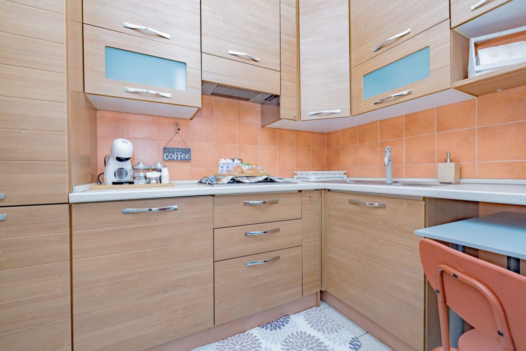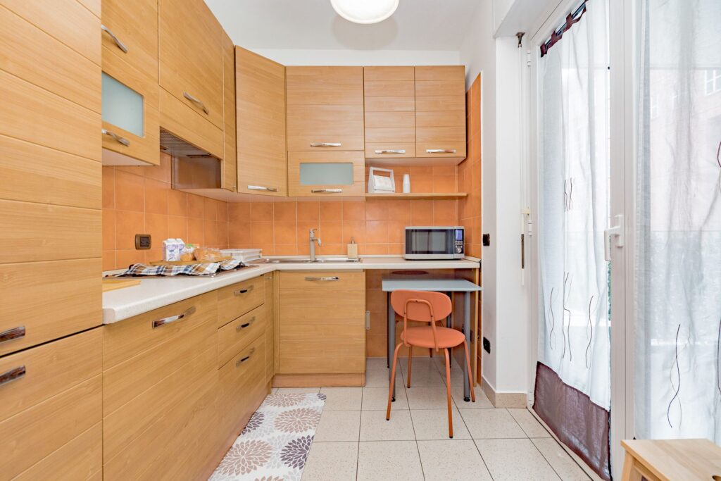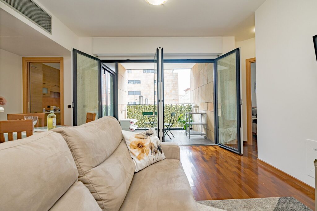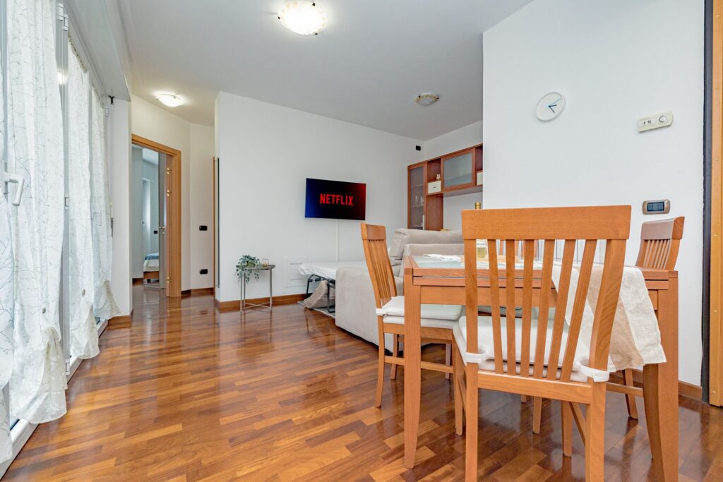 All’interno l’appartamento accoglie con una zona living luminosa, arredata con un comodo divano king size e Smart TV, ideale per momenti di relax.