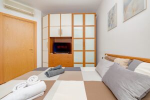 La camera da letto padronale è spaziosa e ben organizzata, con doppia armadiatura, Smart TV e aria condizionata, pensata per offrire il massimo comfort. La cucina, moderna e funzionale, è dotata di piano cottura, frigorifero, freezer, macchina da caffè, bollitore e tutto il necessario per cucinare e vivere la casa al meglio. Completa la proprietà un ampio bagno finestrato, elegante e pratico, con vasca e box in vetro, lavabo, WC, bidet e lavatrice.