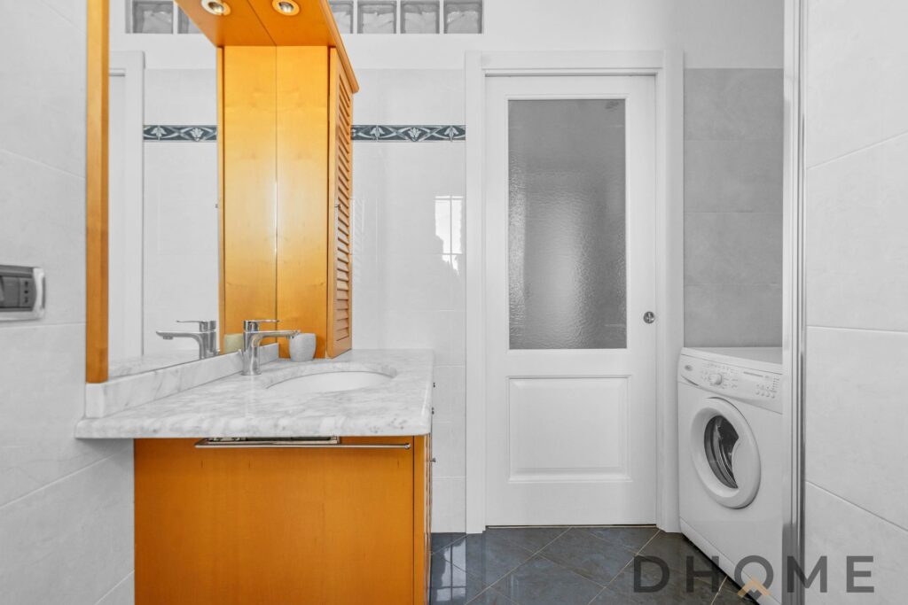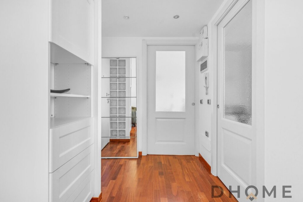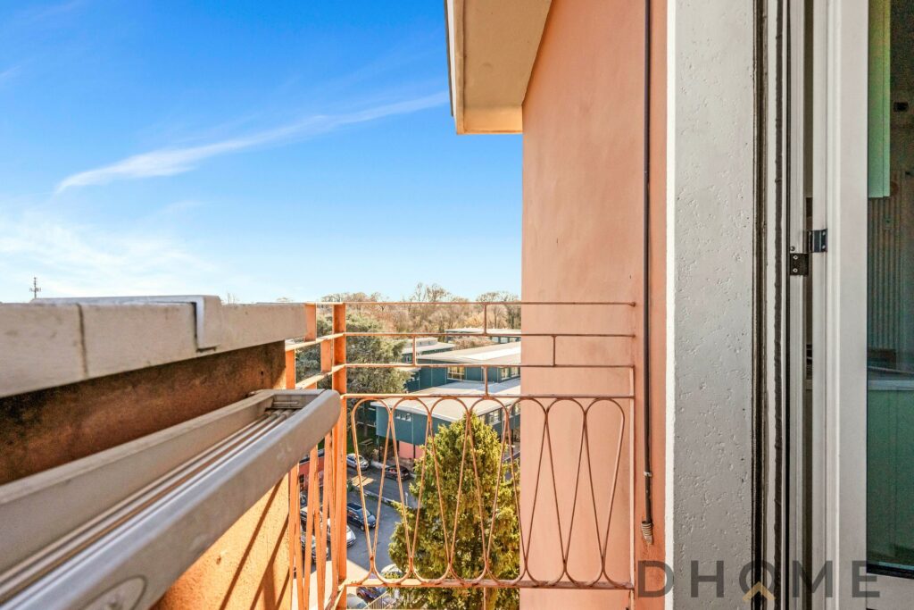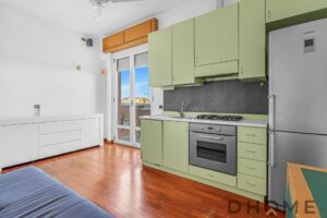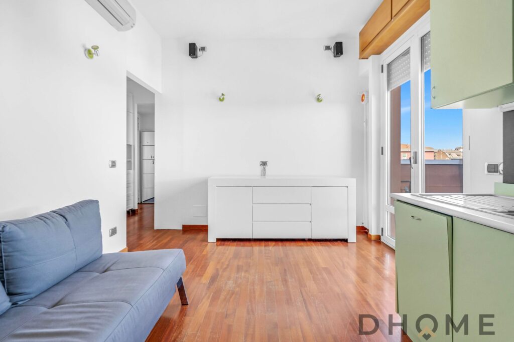 L’ingresso si apre su un ampio disimpegno che distribuisce armoniosamente gli ambienti: la zona giorno accoglie un soggiorno con cucina a vista, funzionale e ben organizzata, con accesso diretto al balcone. La zona notte è composta da una spaziosa camera matrimoniale, mentre il bagno, finestrato, è completo di box doccia. Completa la disposizione interna un pratico locale lavanderia e un comodo ripostiglio in quota nel disimpegno, ideale per ottimizzare gli spazi.