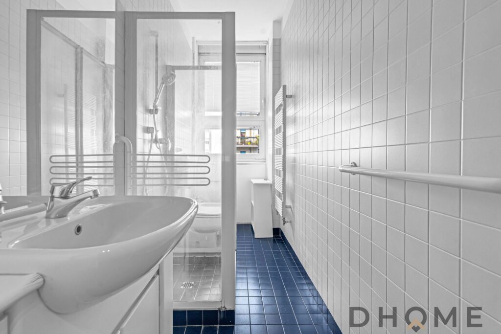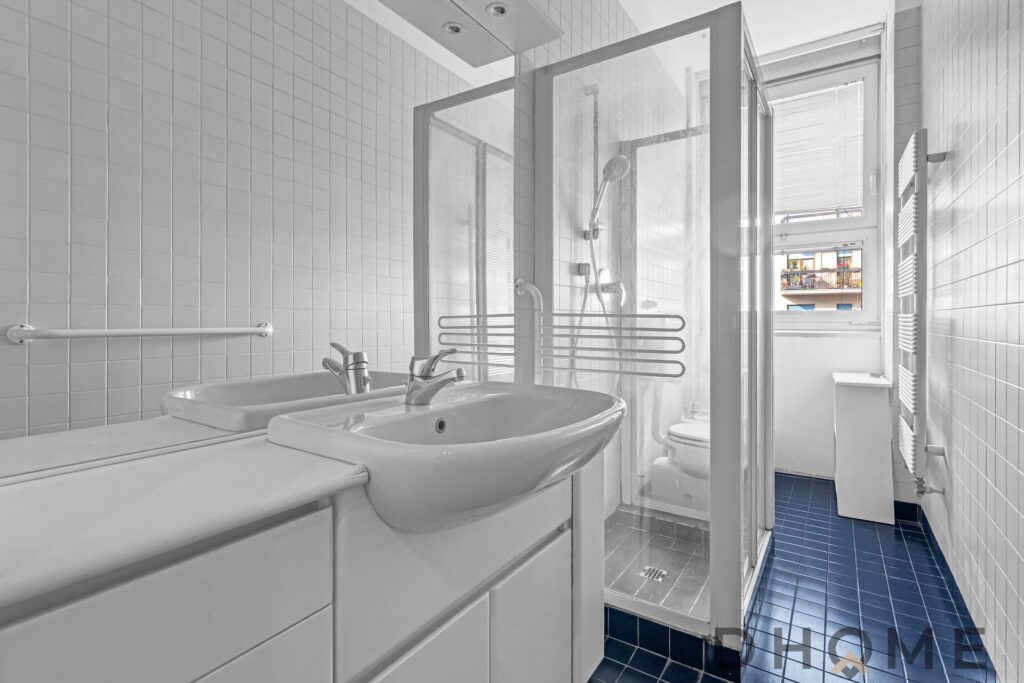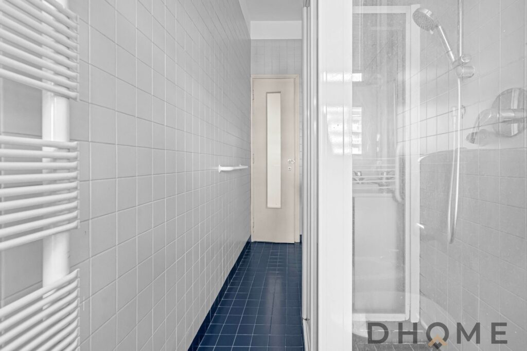 Dal disimpegno si accede al bagno finestrato con box doccia e alla zona principale dell’abitazione.
