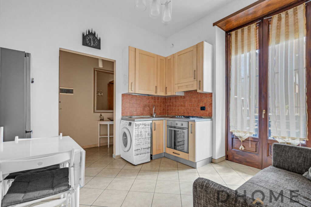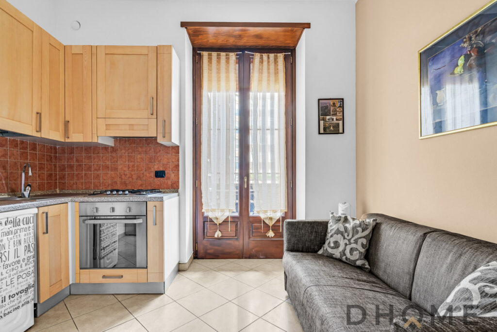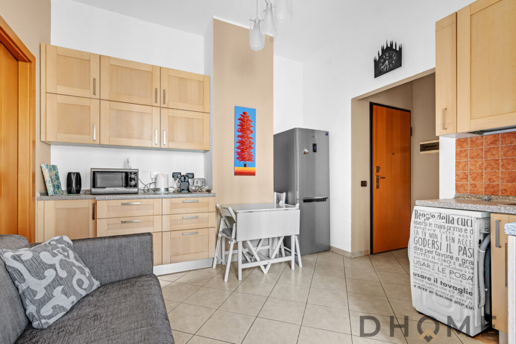 L’appartamento si apre su un disimpegno d’ingresso che conduce a un bagno finestrato, proseguendo poi verso un luminoso soggiorno con cucina a vista e accesso a un balcone. La zona notte è composta da una spaziosa camera da letto matrimoniale.