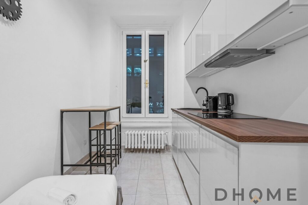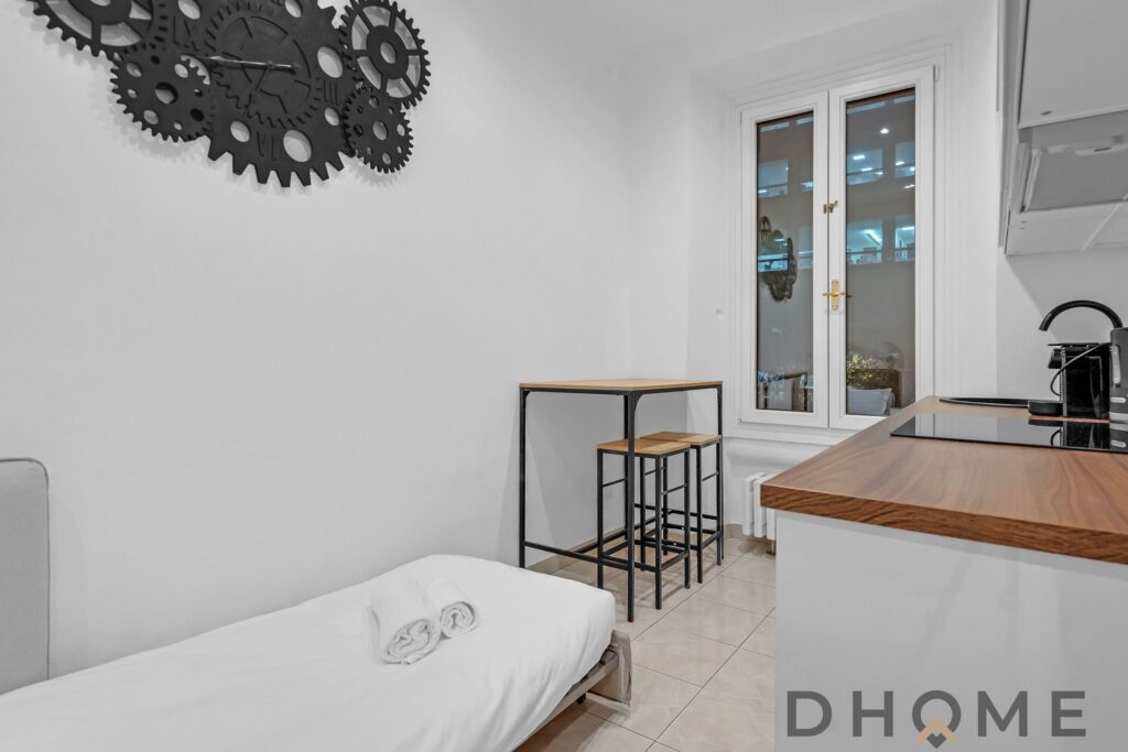 L’abitazione è composta da ingresso su disimpegno che conduce alla zona giorno con cucina a vista dotata di piano a induzione, bagno finestrato con box doccia e camera da letto matrimoniale.