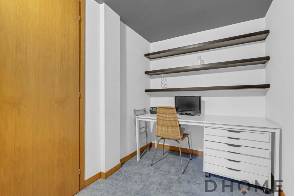 L’appartamento si distingue per luminosità e per l’intelligente distribuzione degli spazi. Dall’ingresso si accede a un ampio soggiorno con cucina a vista, organizzato intorno a un grande tavolo su misura che definisce in modo naturale l’area living. Uno dei punti di forza è lo studio spazioso e ben separato, collocato tra la zona giorno e la zona notte, perfetto per lavorare o studiare senza disturbi. Subito dopo lo studio si accede al bagno, funzionale e finestrato, dotato di box doccia e sanitari sospesi.