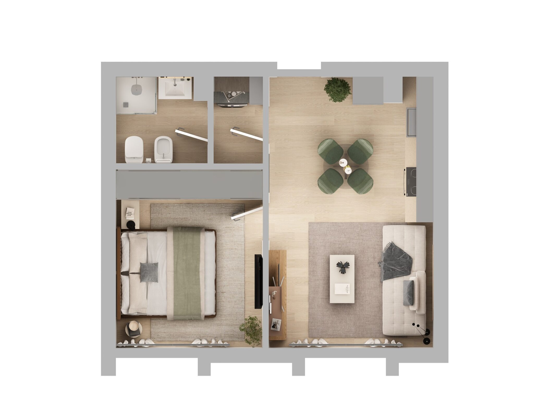 Proponiamo in vendita un elegante bilocale al piano terra, ideale per giovani coppie, professionisti o come investimento a reddito.