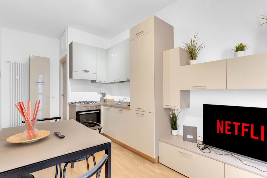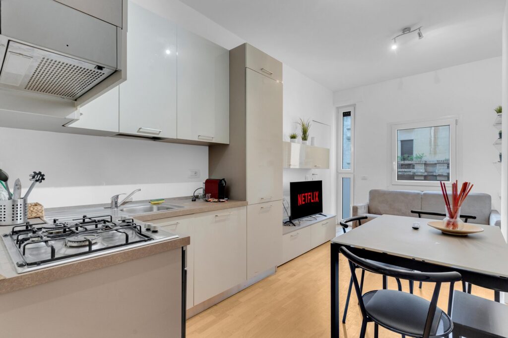 L’appartamento è così composto: Ingresso in soggiorno con cucina a vista , camera, e bagno.