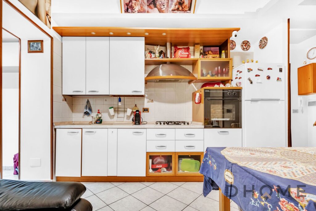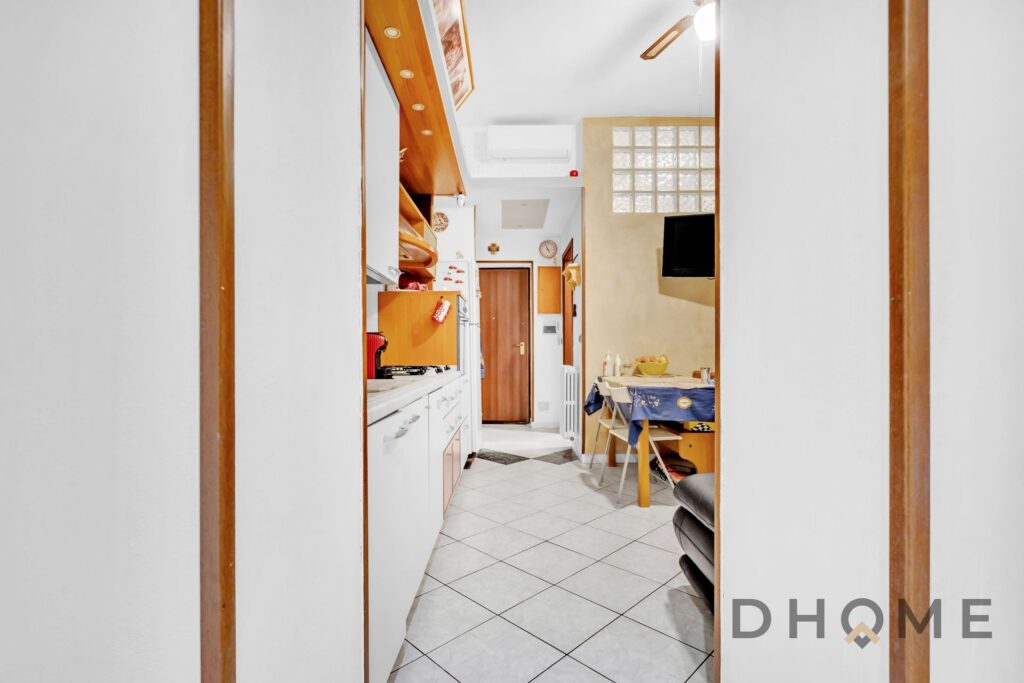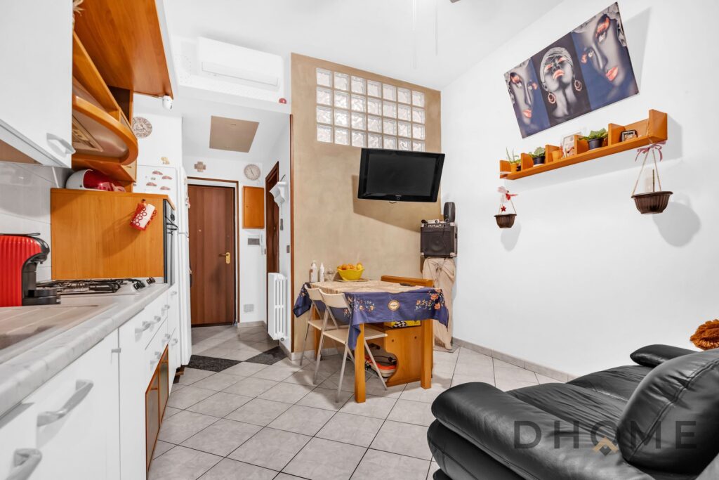 ingresso in disimpegno, soggiorno con cucina a vista, camera da letto matrimoniale, ripostiglio e bagno con doccia.