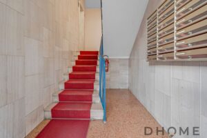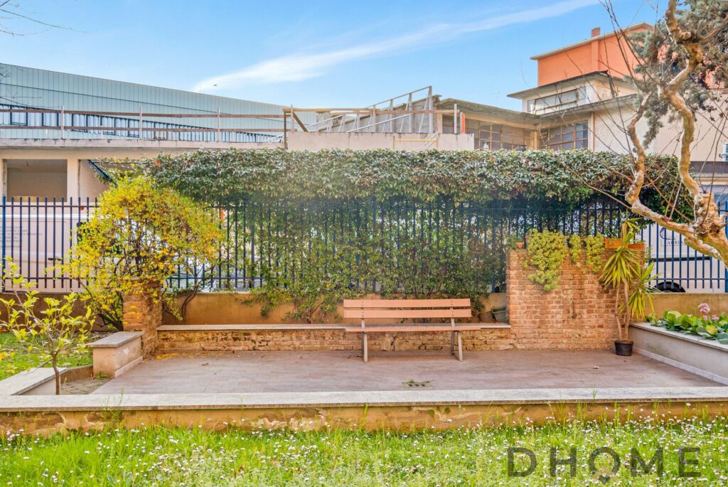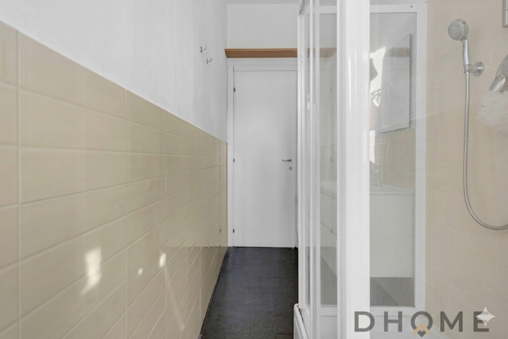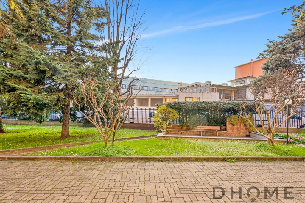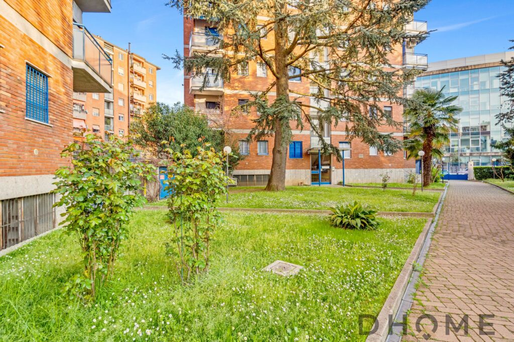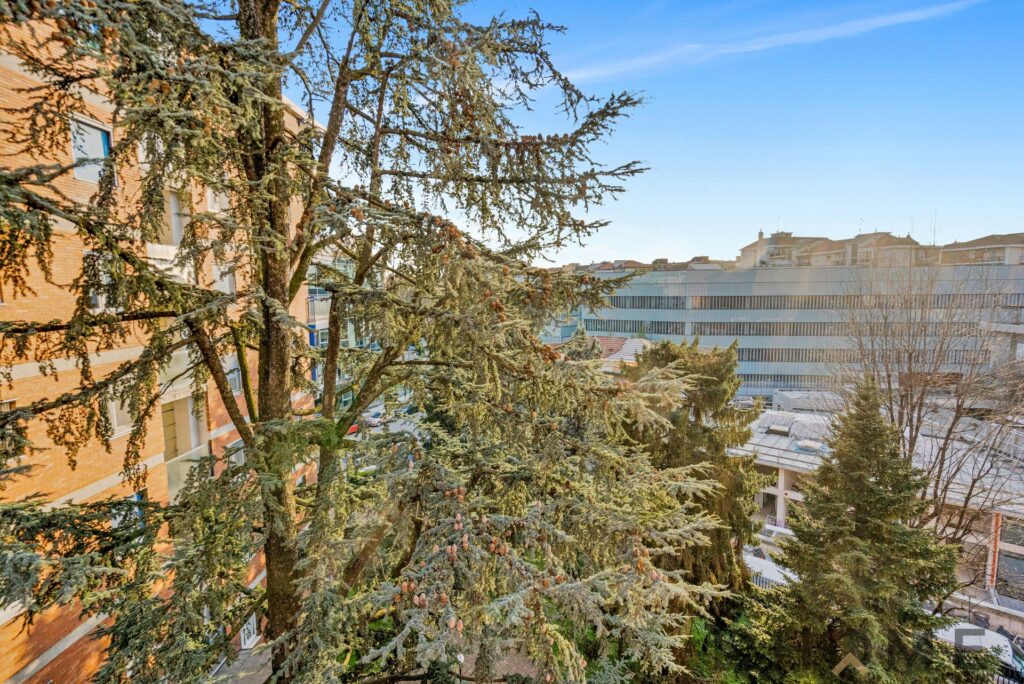 Gli spazi interni sono ben distribuiti: l’ingresso conduce a un disimpegno, dal quale si accede al soggiorno con cucina a vista e uscita sul balcone. La zona giorno, grazie all’esposizione angolare, gode di un affaccio interno tranquillo su un cortile alberato, bagno finestrato con box doccia, ripostiglio e una camera da letto matrimoniale.