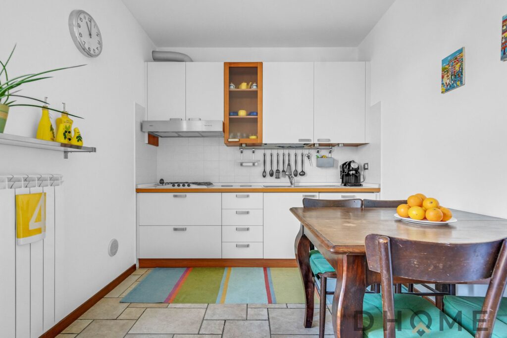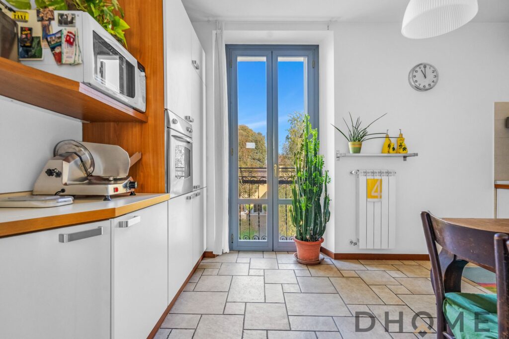 La cucina abitabile, completamente attrezzata, si affaccia su una zona interna silenziosa e immersa nel verde.