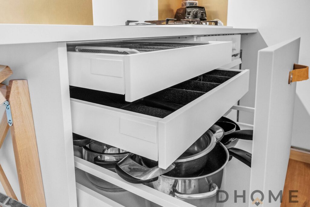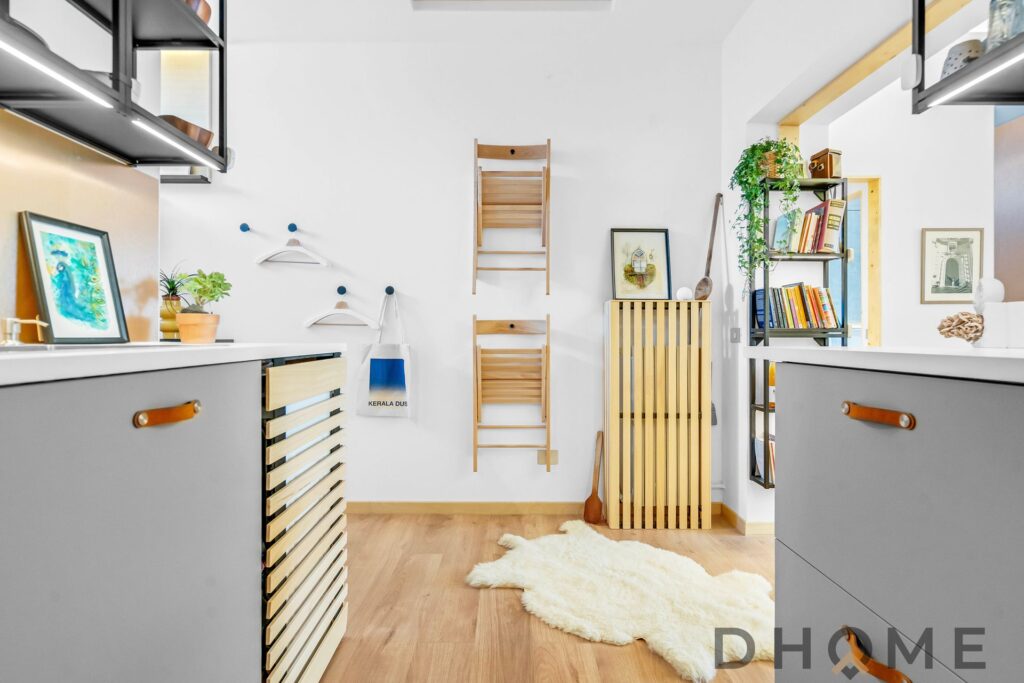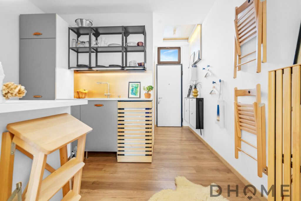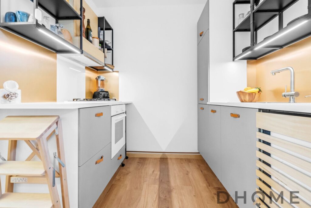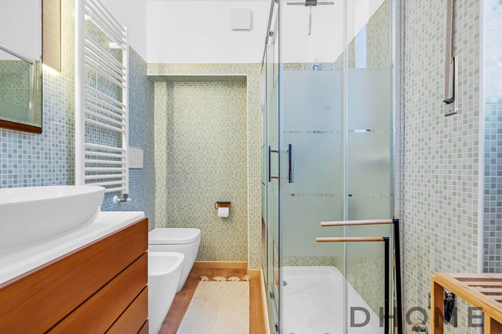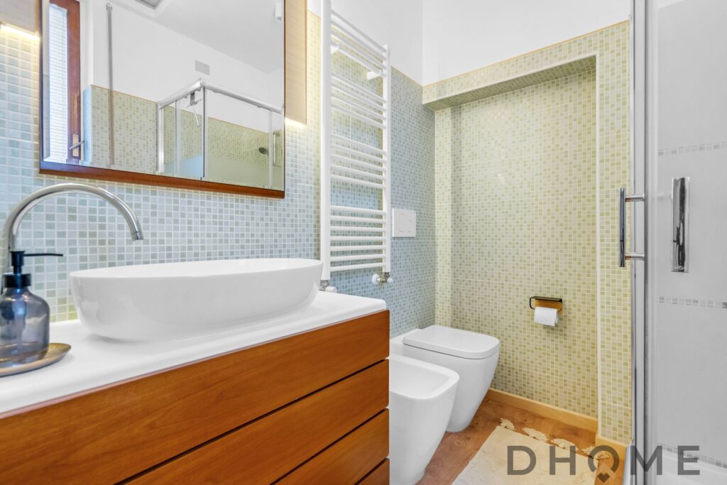 L’ingresso introduce immediatamente a una distribuzione razionale degli spazi: sulla destra si trova il bagno, completamente rinnovato con materiali ricercati, sanitari di fascia alta e un’estetica contemporanea ed elegante. Proseguendo, sempre sulla destra, si accede al cucinotto separato, realizzato su misura e perfettamente organizzato, progettato per essere funzionale ma al tempo stesso coerente con lo stile sofisticato dell’abitazione.