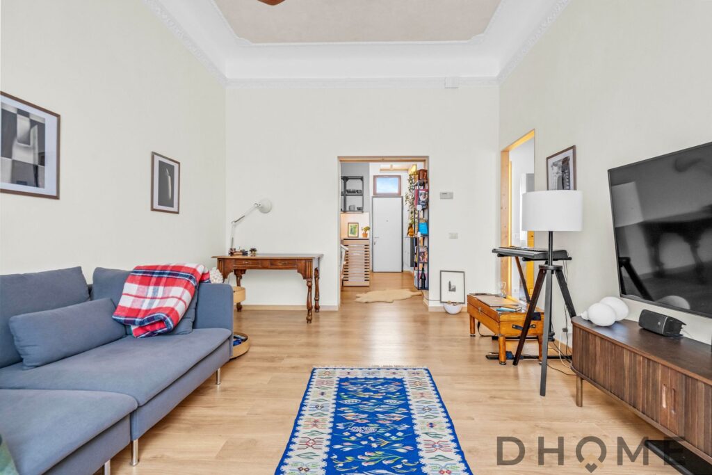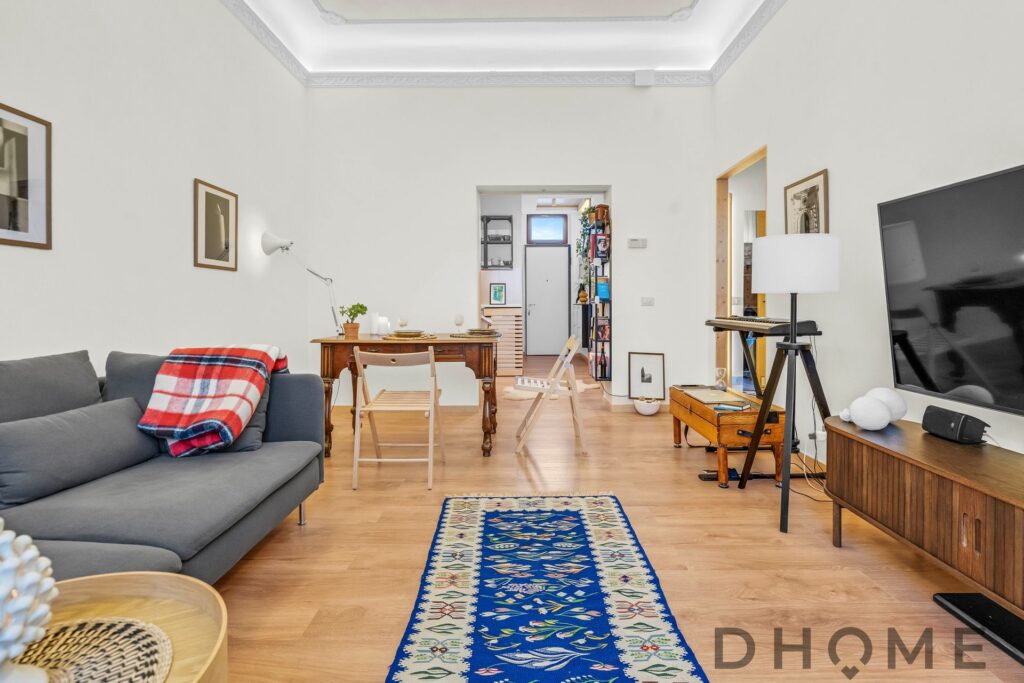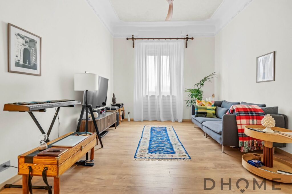 Il soggiorno si sviluppa frontalmente rispetto all’ingresso ed è il cuore della casa, uno spazio accogliente e ben proporzionato, impreziosito da arredi di design su misura e da una scelta attenta di finiture che conferiscono continuità visiva e qualità percepita. Dal lato sinistro del soggiorno si accede al disimpegno che conduce alla zona notte, creando una separazione naturale e funzionale tra gli ambienti giorno e notte.