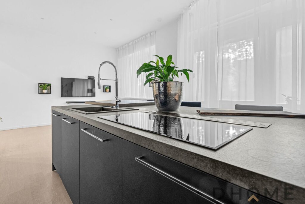 La zona giorno è un vero gioiello: un luminoso open space con una scenografica isola centrale dotata di piano cottura a induzione, ideale per cucinare, intrattenere e vivere la casa con un approccio moderno e conviviale.