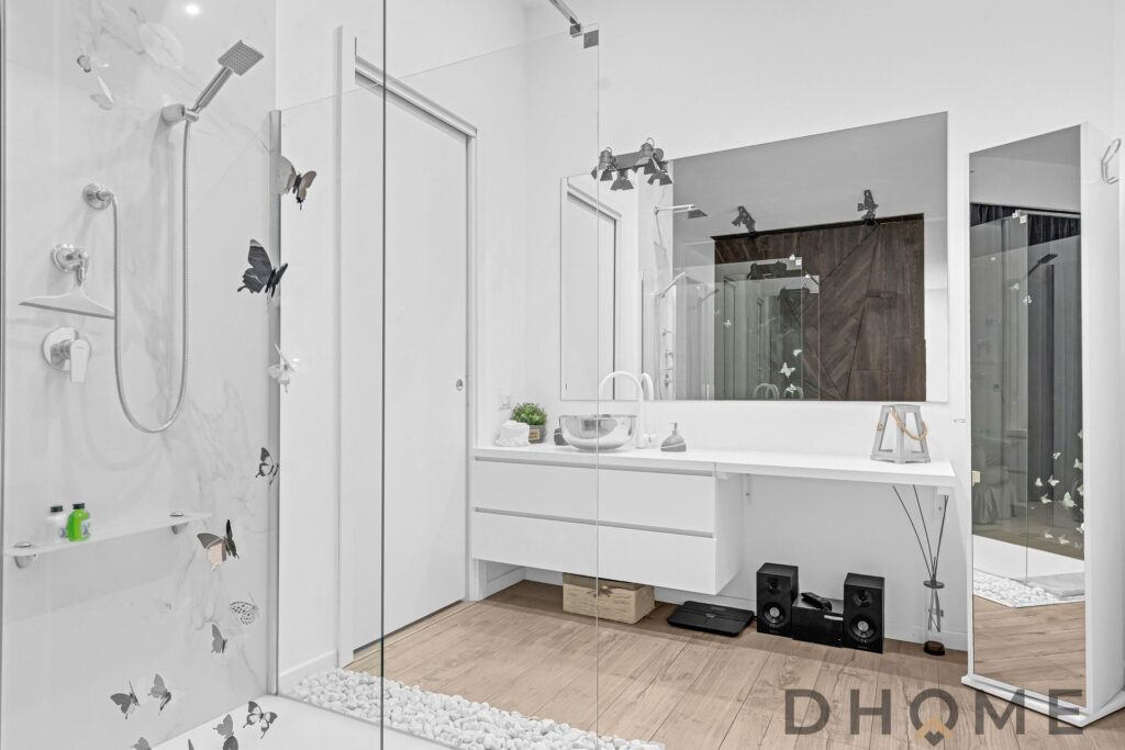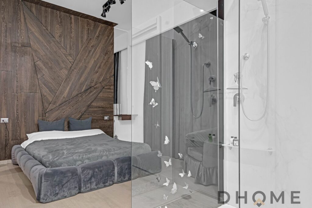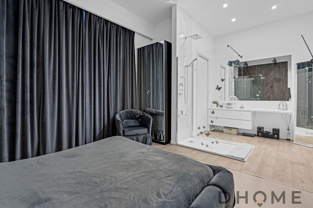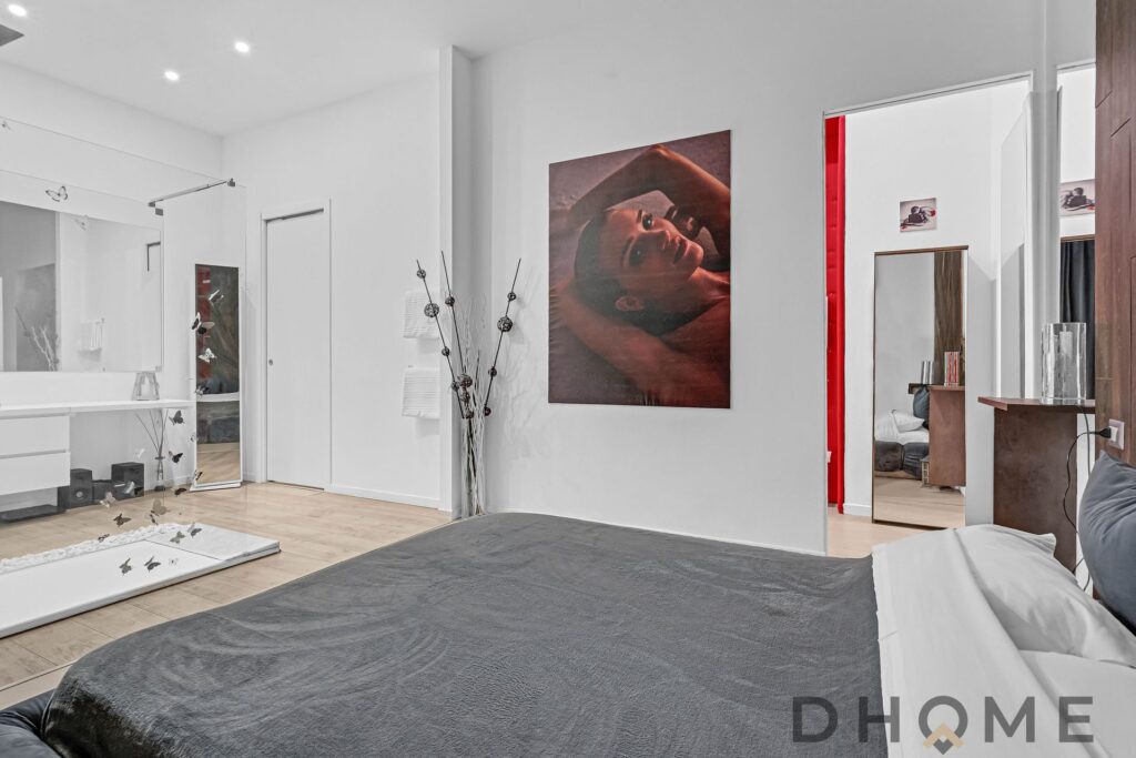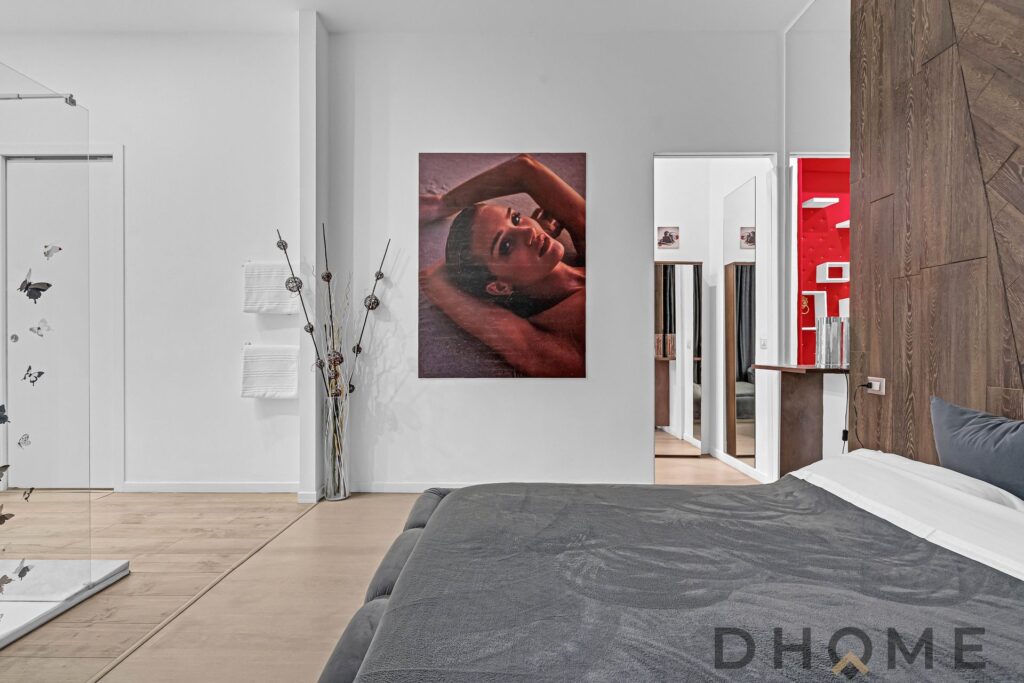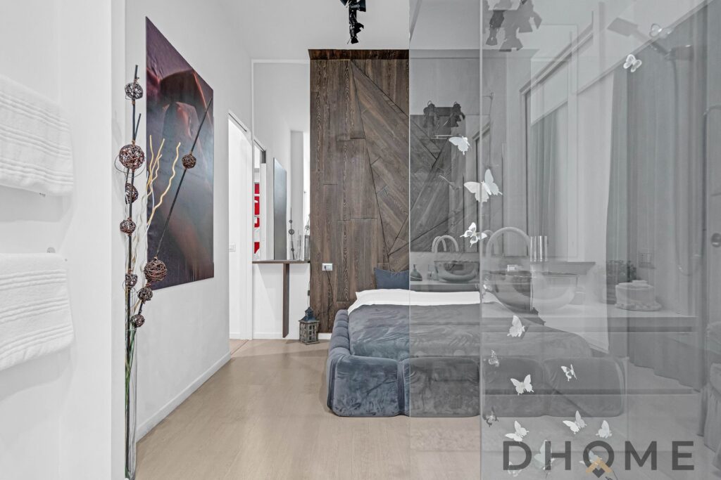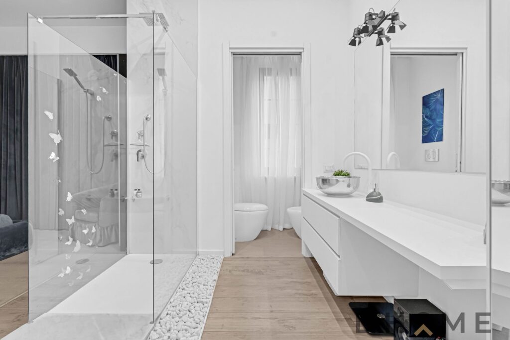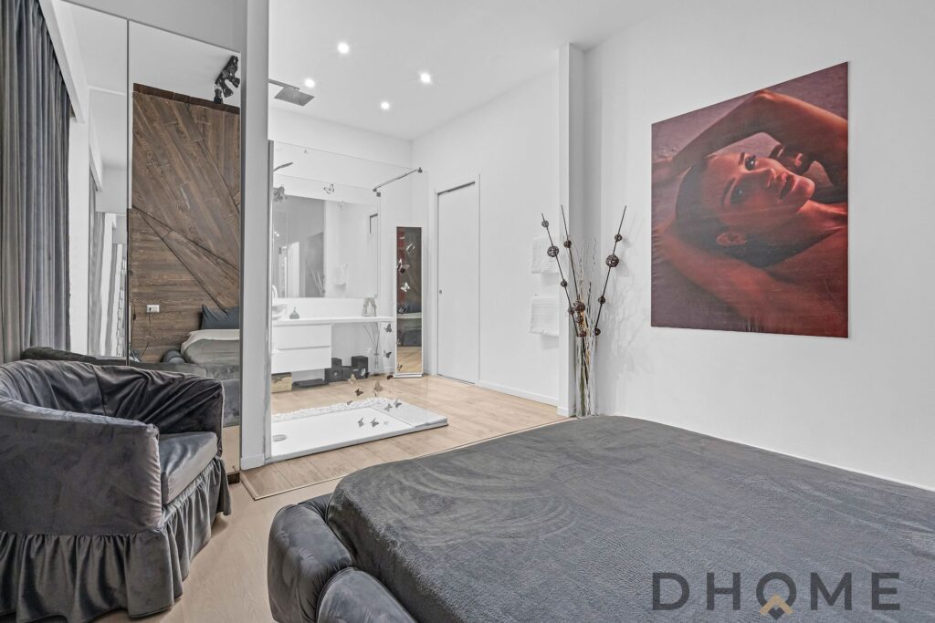 La camera matrimoniale, ampia e ricercata, integra al suo interno un elegante piatto doccia e un raffinato lavabo a vista, affiancato da una comoda console dedicata alla cura personale. Un dettaglio contemporaneo che dona all’ambiente un autentico effetto “boutique hotel”.