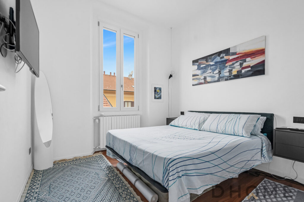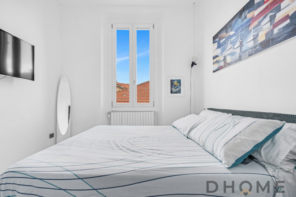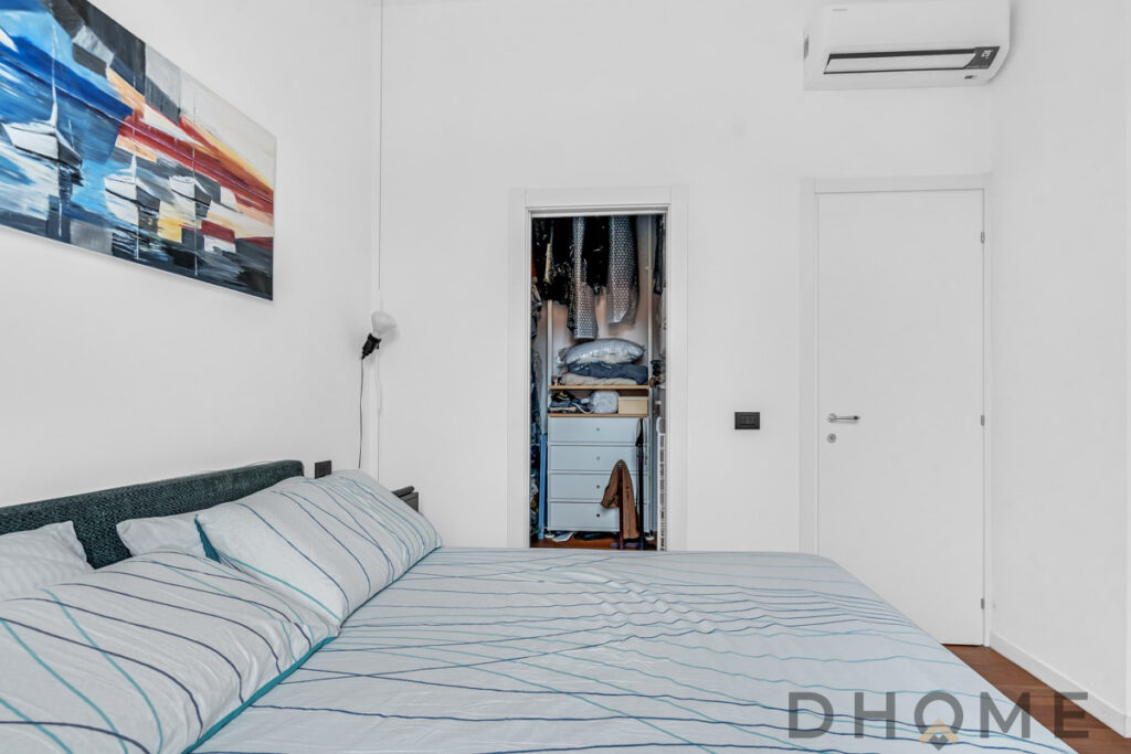 La camera matrimoniale anch’essa molto luminosa dispone di una cabina armadio arredata su misura, pratica e spaziosa.