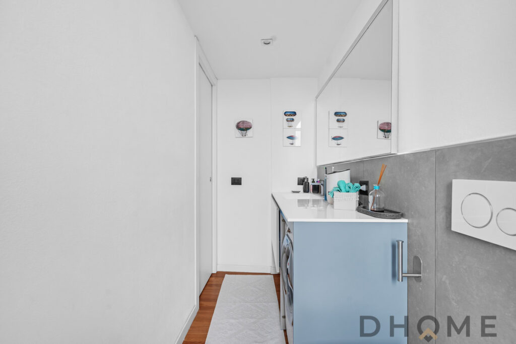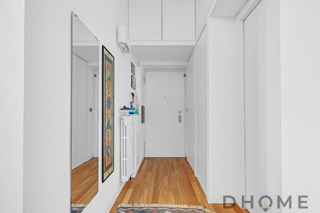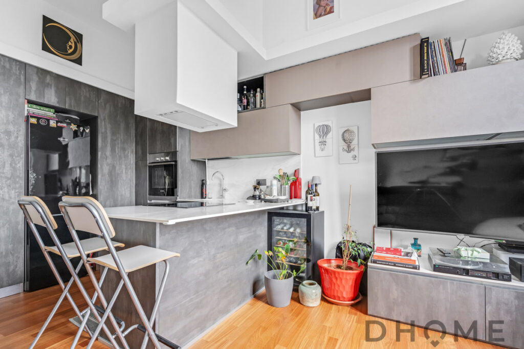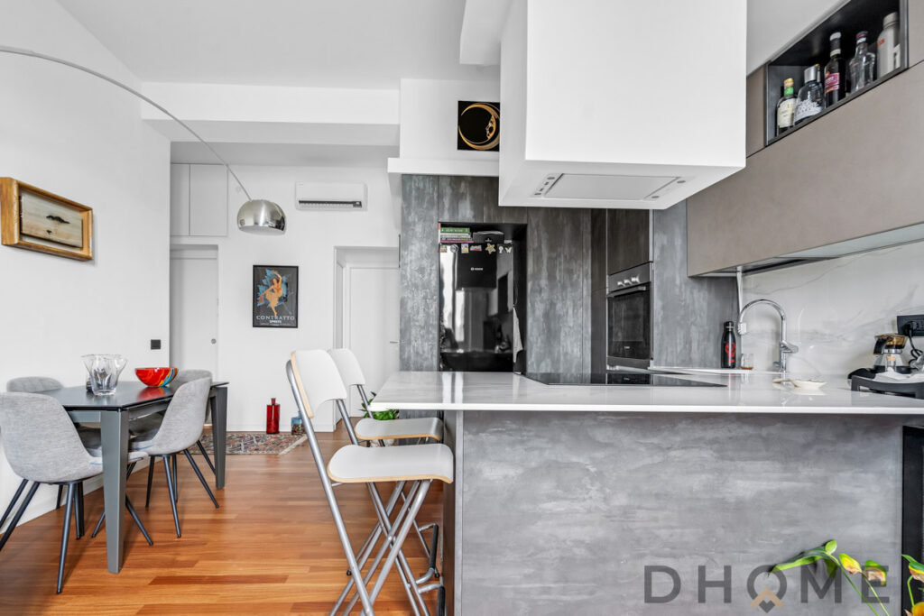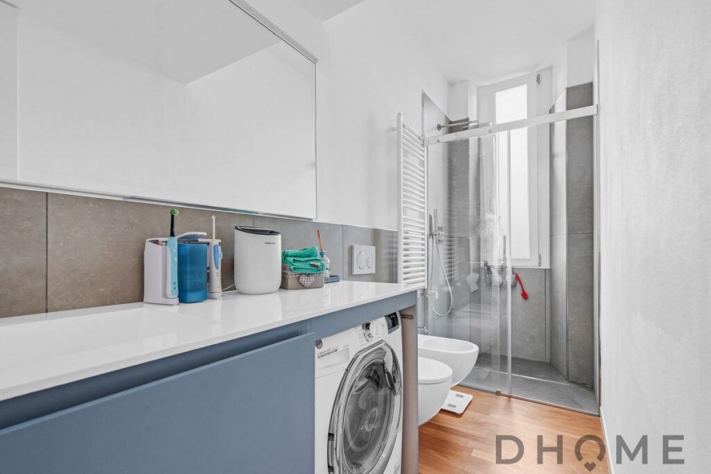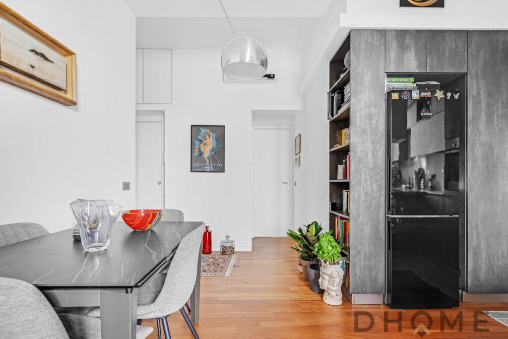 L’ingresso si apre su un comodo disimpegno dove sono state posizionate armadiature a muro su misura per creare dei comodi ripostigli, un soggiorno luminoso esposto verso fondazione Prada, ideale per momenti di relax o convivialitĆ  con una cucina a vista su misura creata artigianalmente con ogni funzionalitĆ  e completa di elettrodomestici.