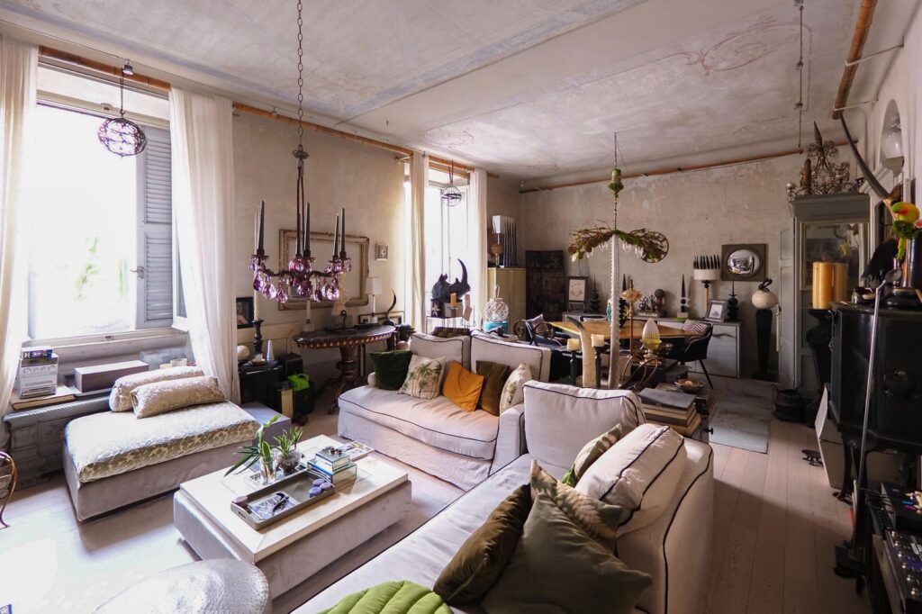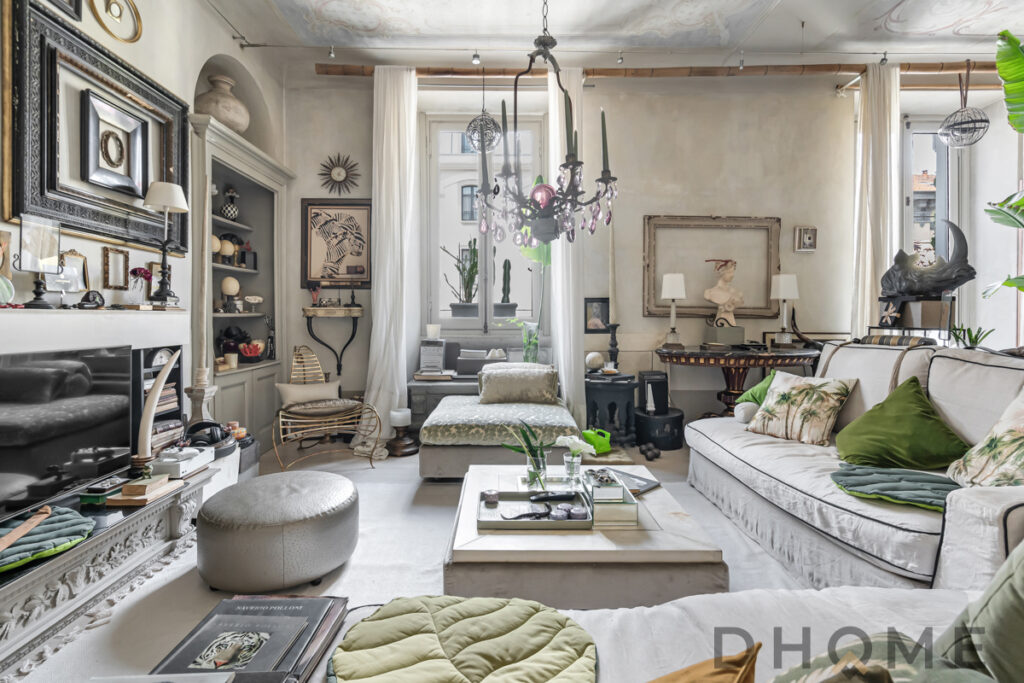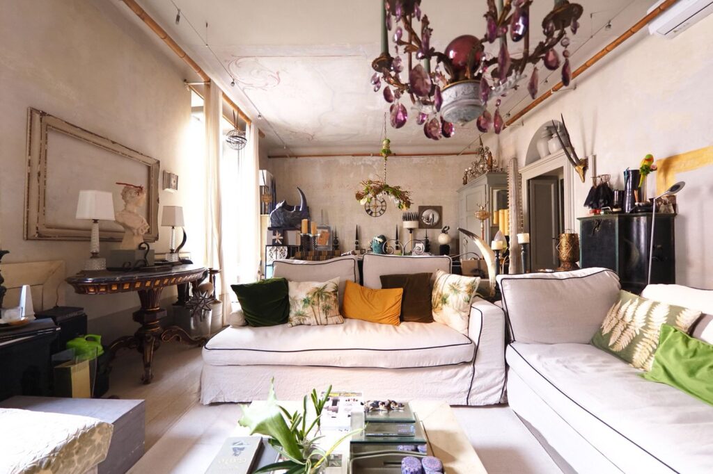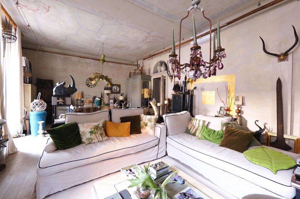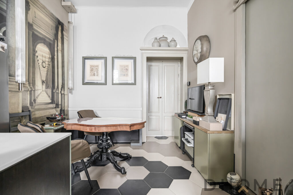 Il soggiorno doppio, vero gioiello della casa, è ampio, luminoso e impreziosito da un balcone. Le pareti e il soffitto conservano affreschi originali d’epoca sapientemente mantenuti, che donano all’ambiente un’eleganza senza tempo e un’atmosfera unica, caratteristica principale di questo splendido appartamento.
