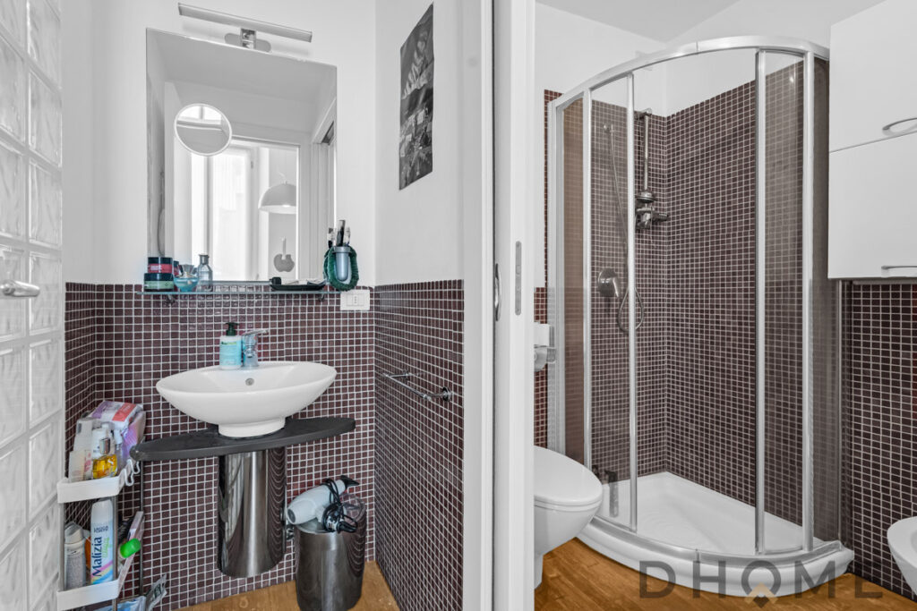 ingresso tramite porta blindata in spaziosa zona giorno che è collegata alla cucina abitabile e bagno dotato di box doccia.