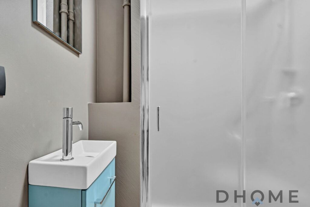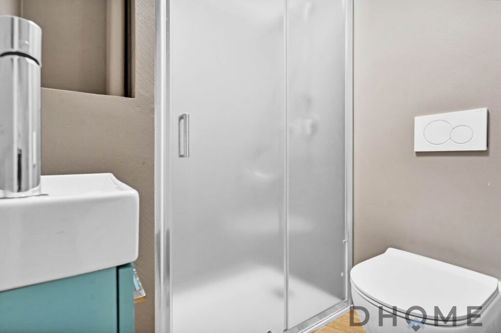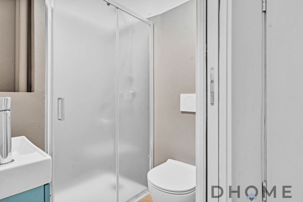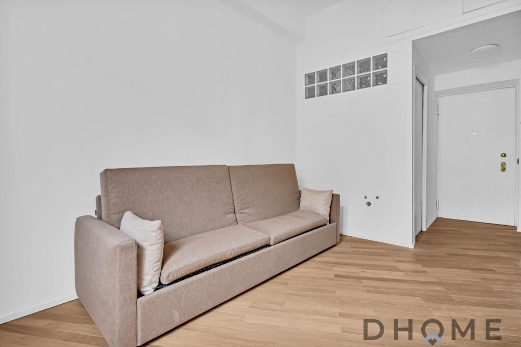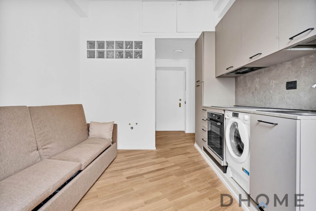 Ingresso in disimpegno, frontalmente troviamo la zona giorno-notte con divano letto apribile che diventa matrimoniale, cucina a vista con piano a induzione e lavatrice. Completa la soluzione il bagno con box doccia.