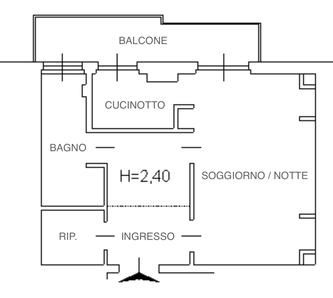 L’immobile si trova al sesto ed ultimo piano di uno stabile civile ed è composto da: ingresso, soggiorno/camera, cucinotto, oltre servizi, balcone e cantina di pertinenza.