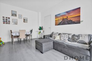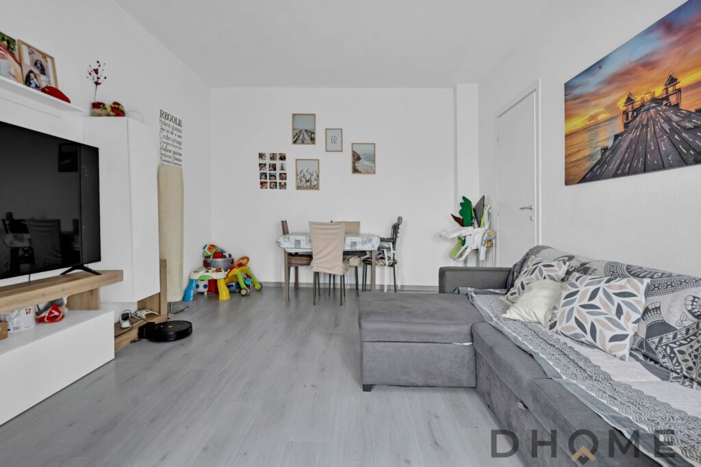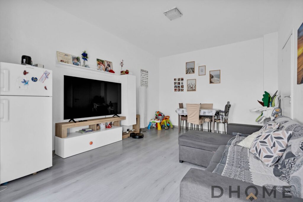 Il soggiorno è accogliente e ben proporzionato, con accesso diretto al cucinotto e soprattutto a un balcone di circa 15 mq, una vera estensione della casa, condiviso anche con la camera da letto.