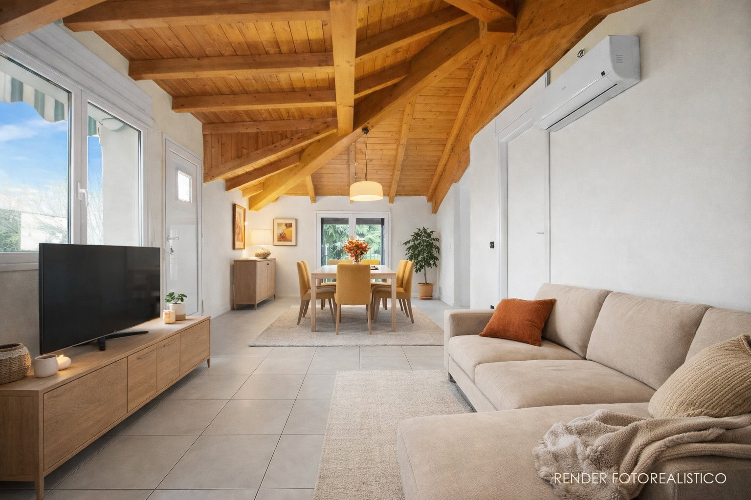 Entrando troviamo ad accoglierci la zona giorno, perfettamente suddivisa tra un luminoso soggiorno con parete tv e la zona pranzo, adiacente all’ingresso della cucina separata.