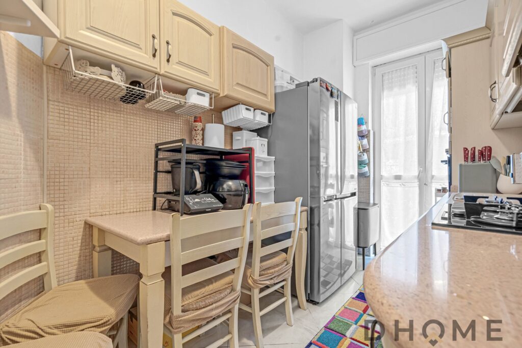 Il soggiorno è accogliente e ben illuminato, mentre la cucina abitabile (con accesso al balcone) è separata, pratica e comoda per l’uso quotidiano.