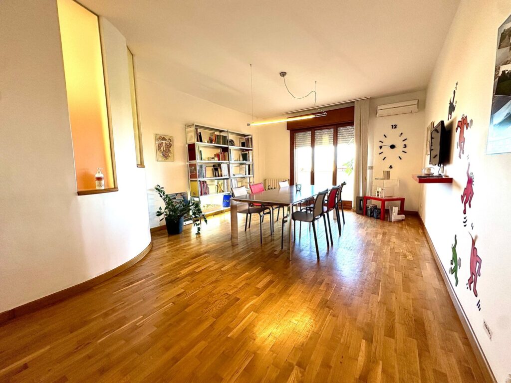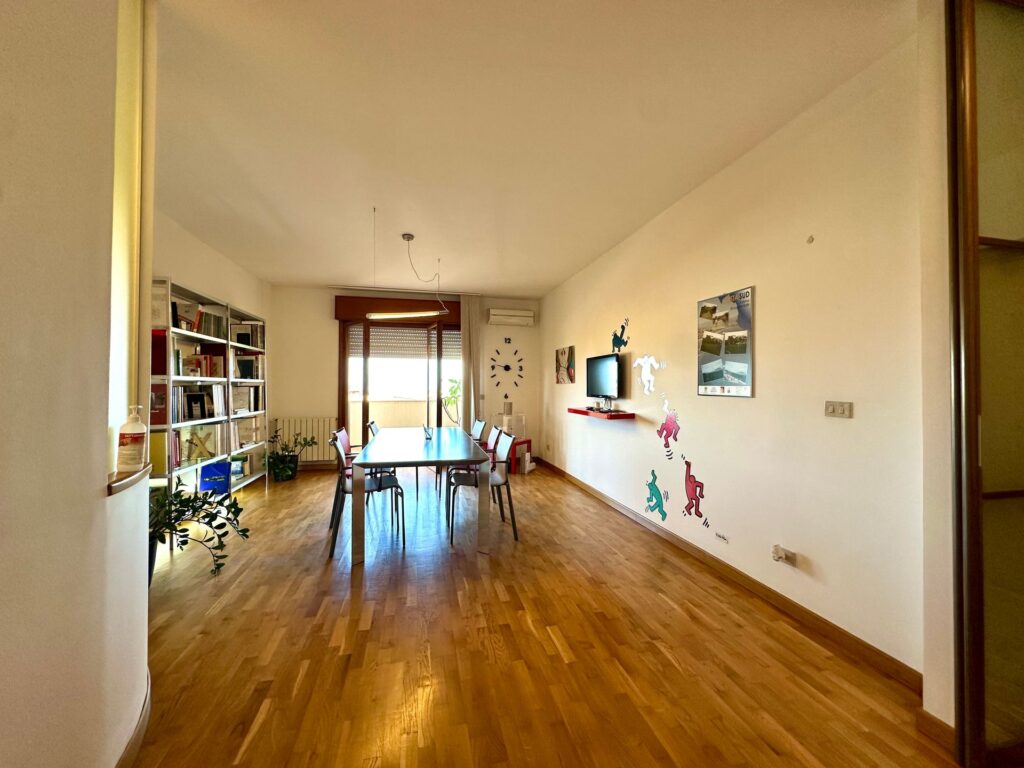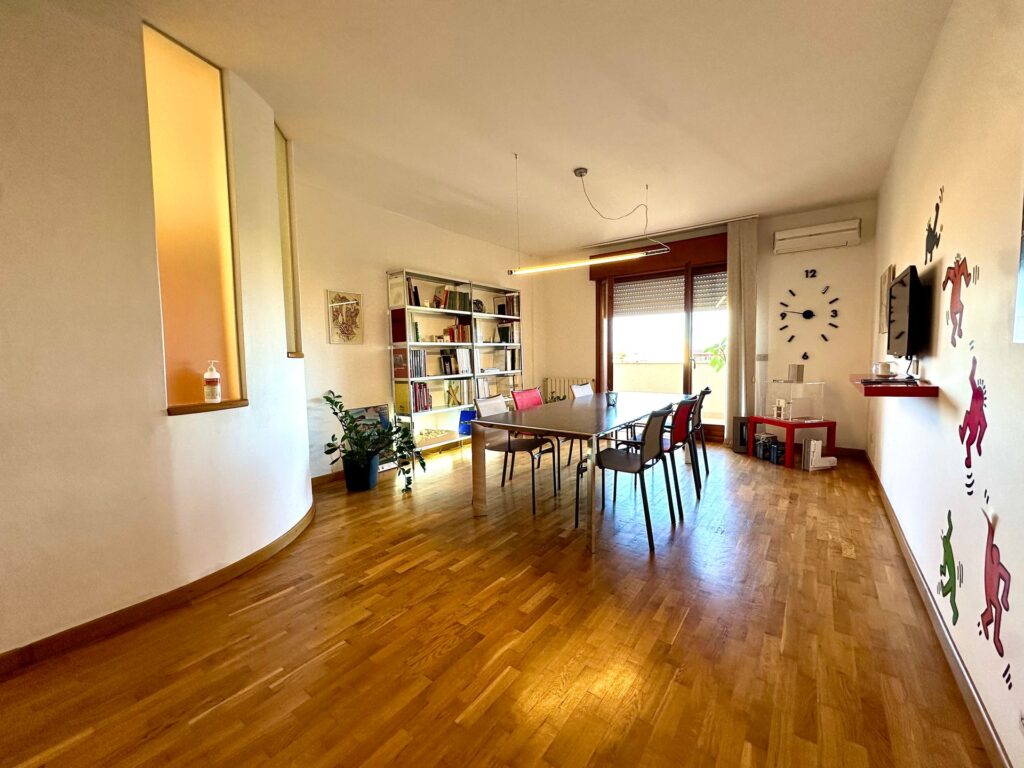 I doppi servizi, entrambi finestrati, sono ben distribuiti: uno con doccia e l’altro con vasca. La pavimentazione in parquet, presente nella maggior parte degli ambienti, conferisce calore e raffinatezza agli spazi.