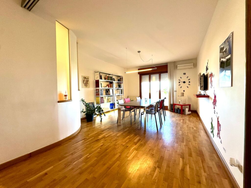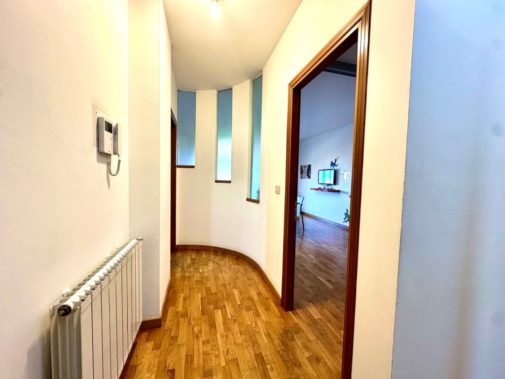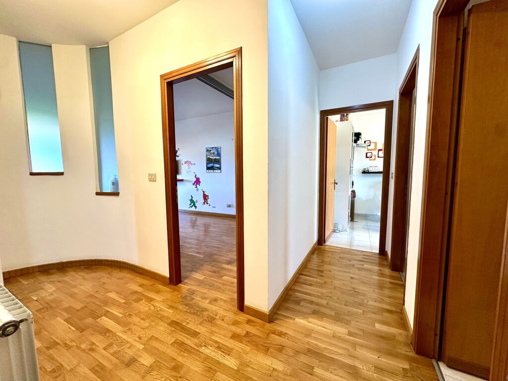 I doppi servizi, entrambi finestrati, sono ben distribuiti: uno con doccia e l’altro con vasca. La pavimentazione in parquet, presente nella maggior parte degli ambienti, conferisce calore e raffinatezza agli spazi.