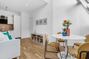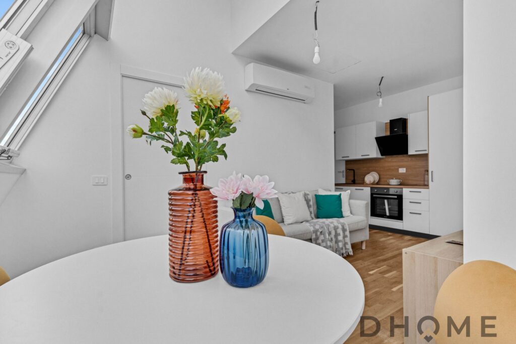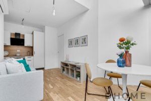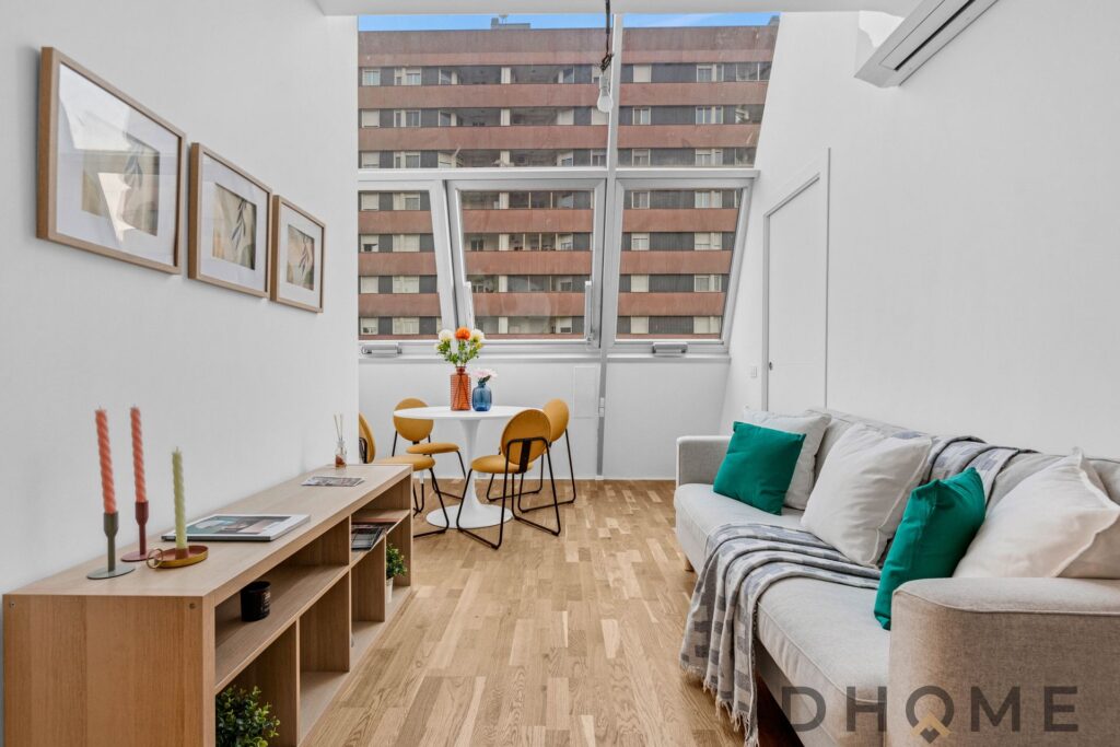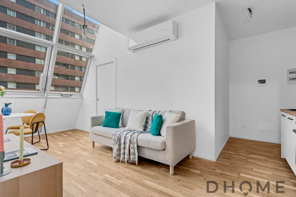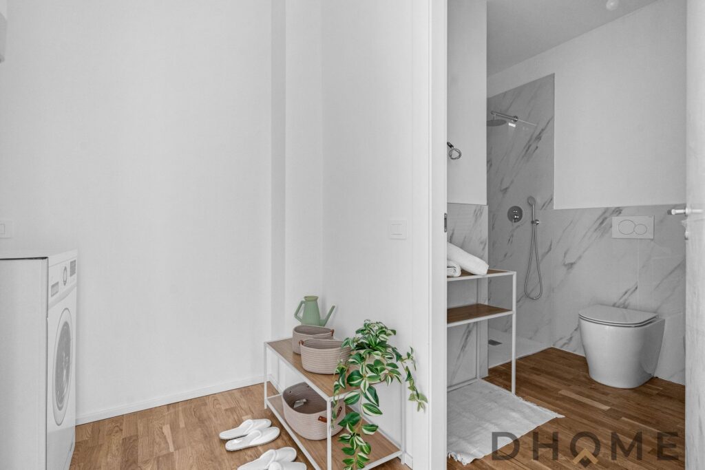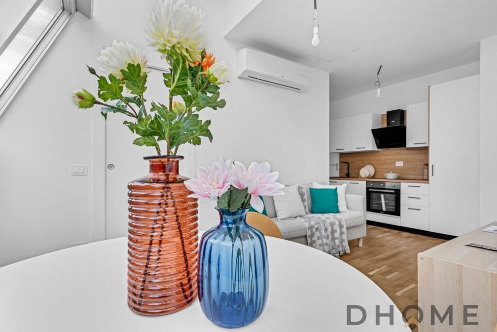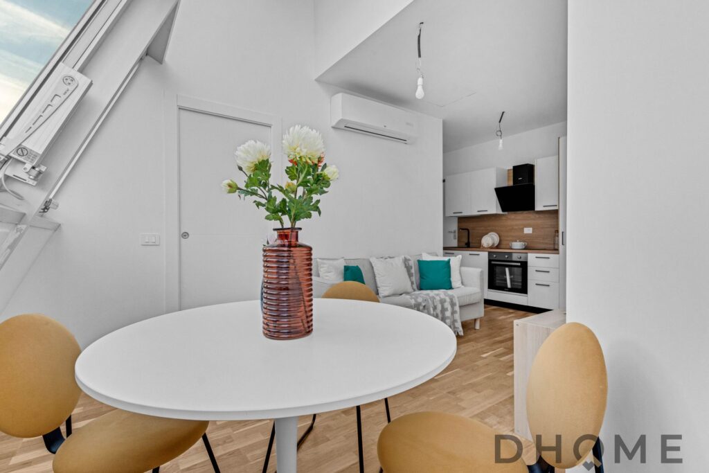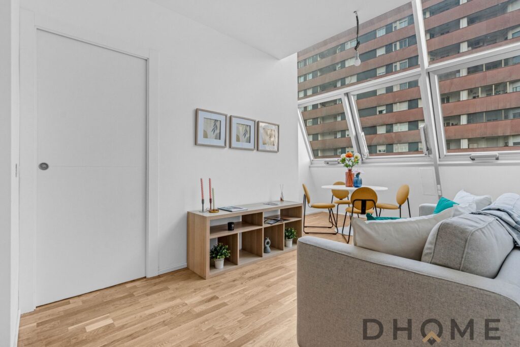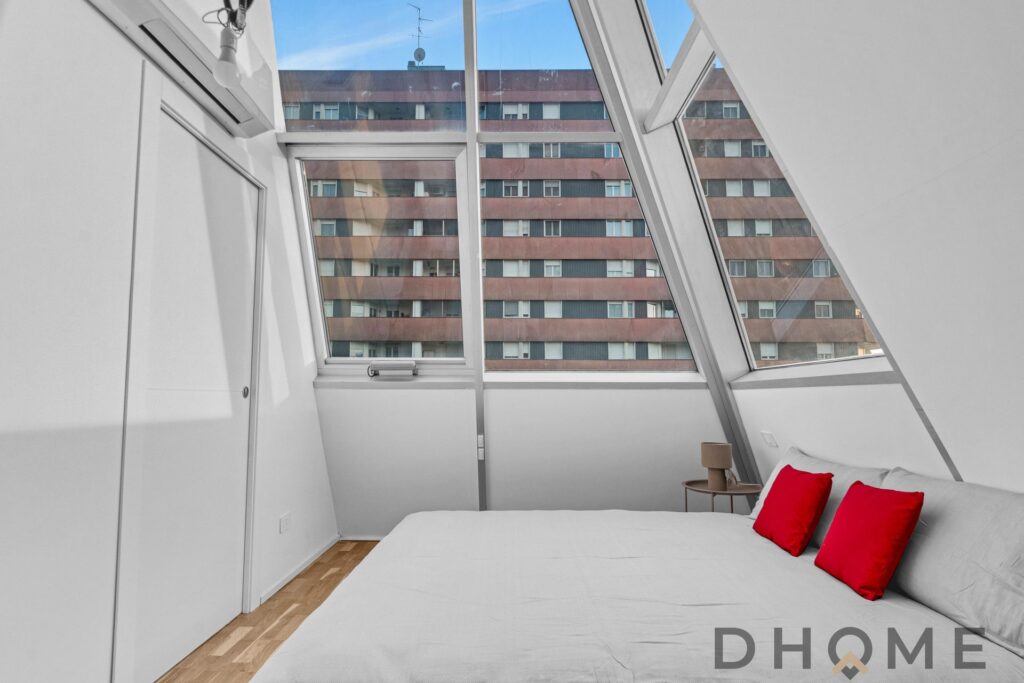 L’appartamento, situato al primo piano, si distingue per le ampie vetrate che regalano una luminosità eccezionale e per le finiture moderne ed eleganti con cui è stato ristrutturato l’immobile.
