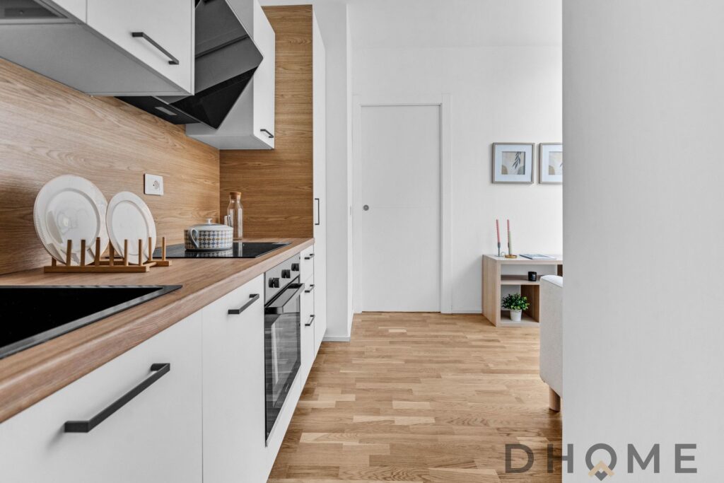 L’ingresso si apre su un’ampia zona living con cucina a vista e pavimentazione in parquet, perfetta per momenti di relax e convivialità.