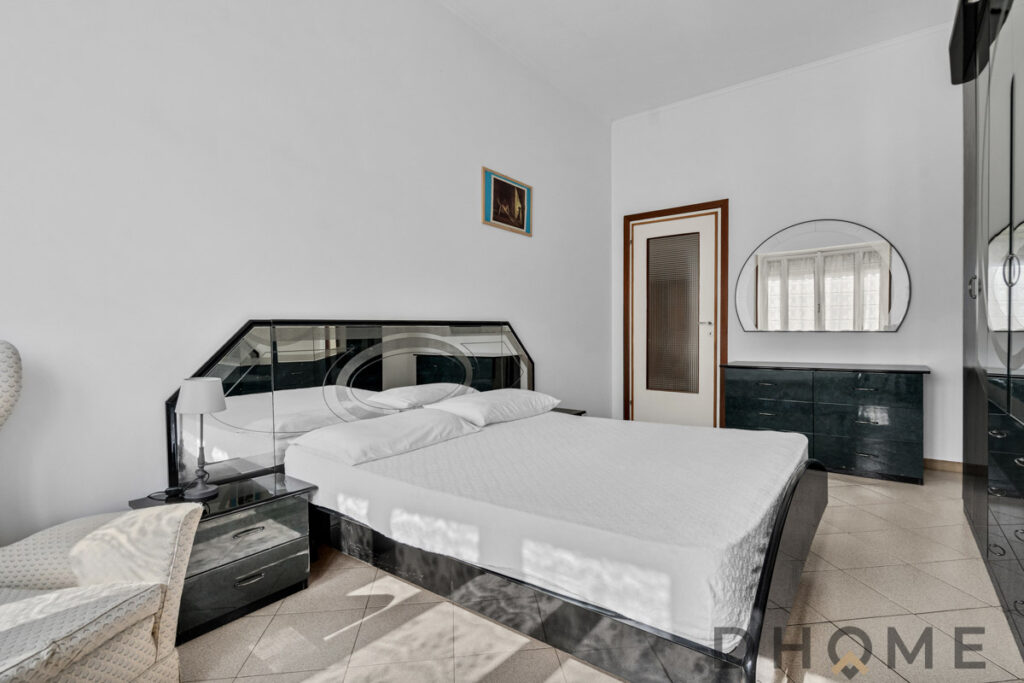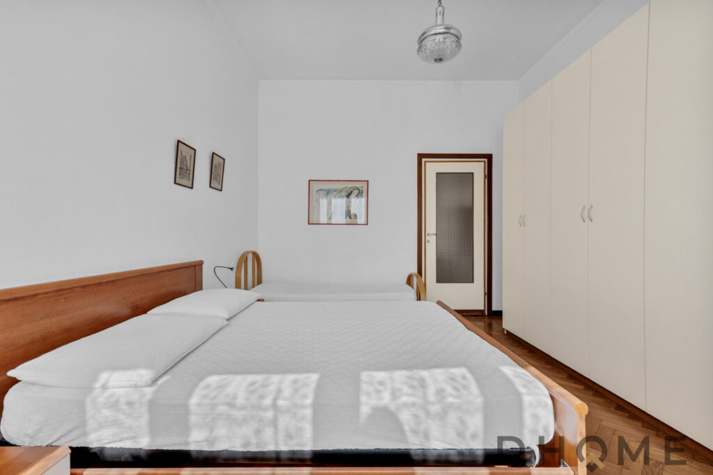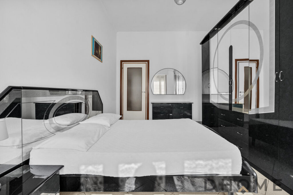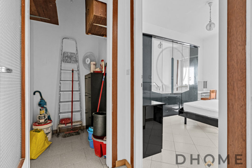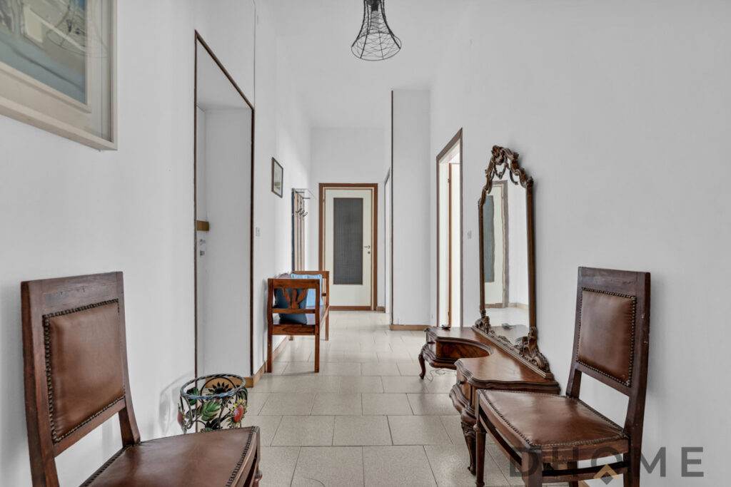 L’ingresso, spazioso e accogliente, è arredato con poltroncine e panca. Il soggiorno, molto luminoso grazie alla finestra tripla, è arredato con un divano angolare, un secondo divano, tavolino, tavolo con sedie, mobile a giorno e una poltrona. La prima camera da letto matrimoniale è dotata di finestra tripla, letto matrimoniale completo, un letto singolo aggiuntivo, scrivania con poltroncina e libreria. Anche la seconda camera è matrimoniale, completa di arredi, con finestra tripla, scrivania, poltrona e ampi spazi. La cucina è completamente attrezzata con elettrodomestici in classe A++, inclusa la lavastoviglie. Il bagno dispone di un grande box doccia e lavatrice. È presente un comodo ripostiglio con scarpiera e armadietti, oltre a una cantina di pertinenza.