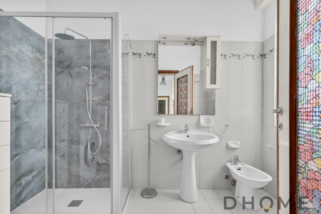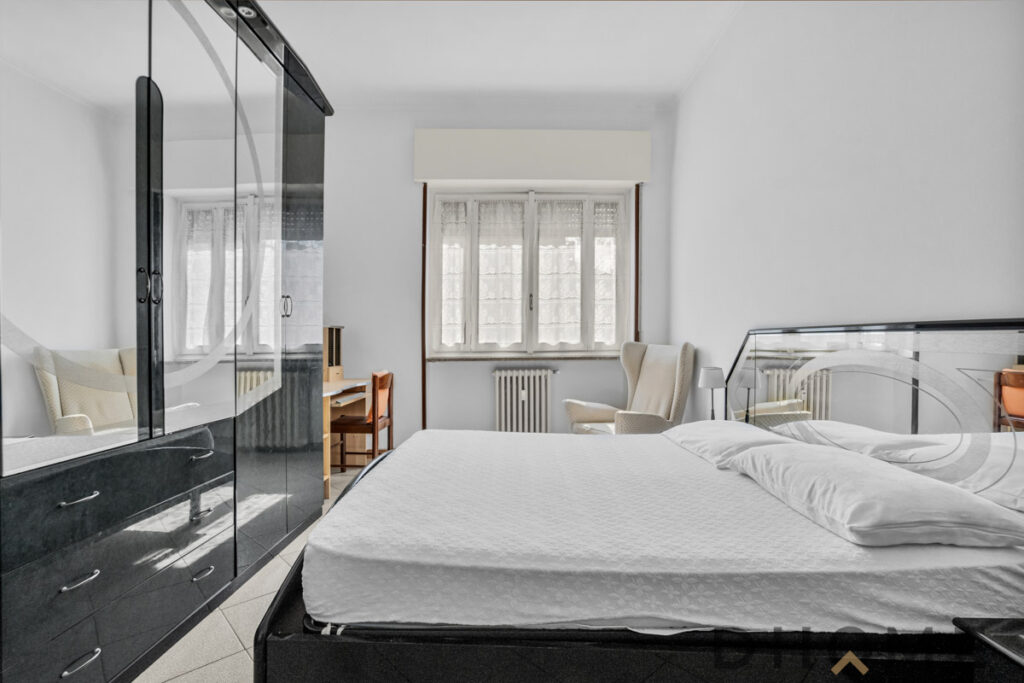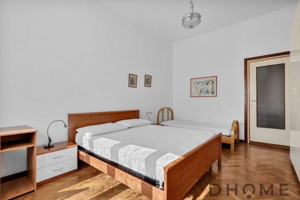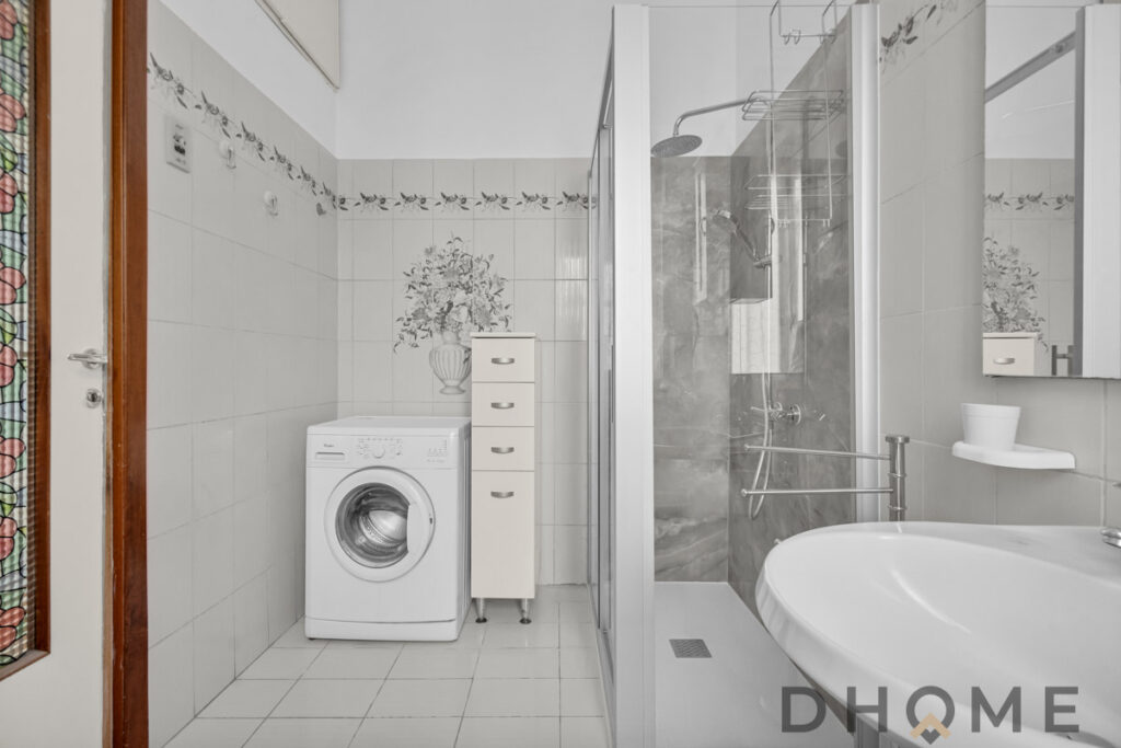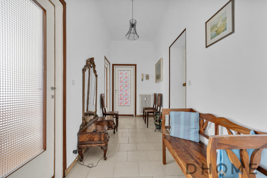 L’ingresso, spazioso e accogliente, è arredato con poltroncine e panca. Il soggiorno, molto luminoso grazie alla finestra tripla, è arredato con un divano angolare, un secondo divano, tavolino, tavolo con sedie, mobile a giorno e una poltrona. La prima camera da letto matrimoniale è dotata di finestra tripla, letto matrimoniale completo, un letto singolo aggiuntivo, scrivania con poltroncina e libreria. Anche la seconda camera è matrimoniale, completa di arredi, con finestra tripla, scrivania, poltrona e ampi spazi. La cucina è completamente attrezzata con elettrodomestici in classe A++, inclusa la lavastoviglie. Il bagno dispone di un grande box doccia e lavatrice. È presente un comodo ripostiglio con scarpiera e armadietti, oltre a una cantina di pertinenza.
