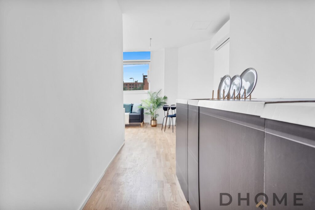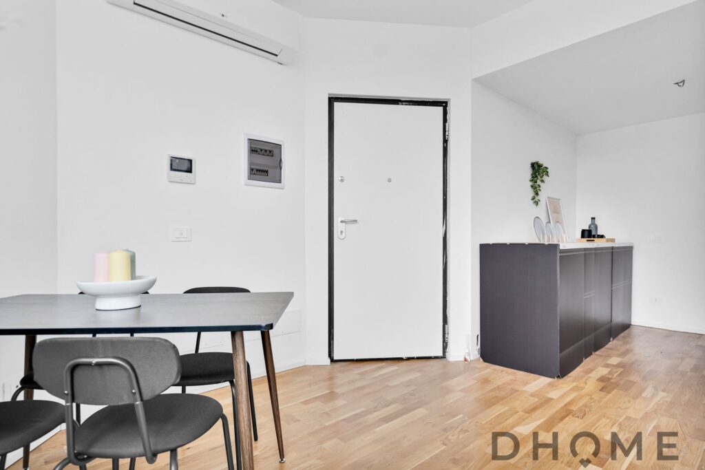 L’appartamento, situato al primo piano, si distingue per le ampie vetrate che regalano una luminosità eccezionale e per le finiture moderne ed eleganti con cui è stato ristrutturato l’immobile.