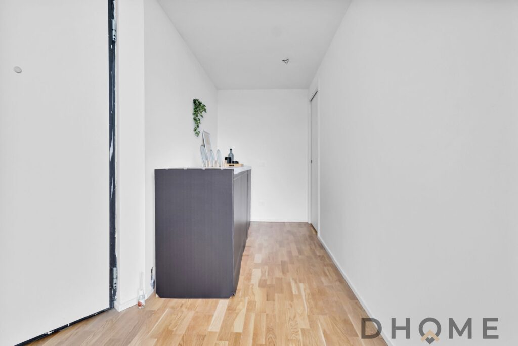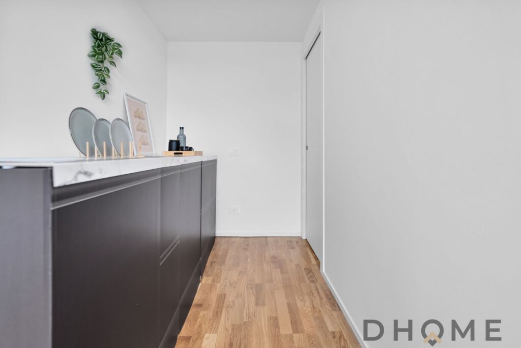 L’ingresso si apre su un’ampia zona living con cucina a vista e pavimentazione in parquet, perfetta per momenti di relax e convivialità.