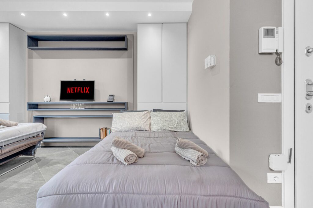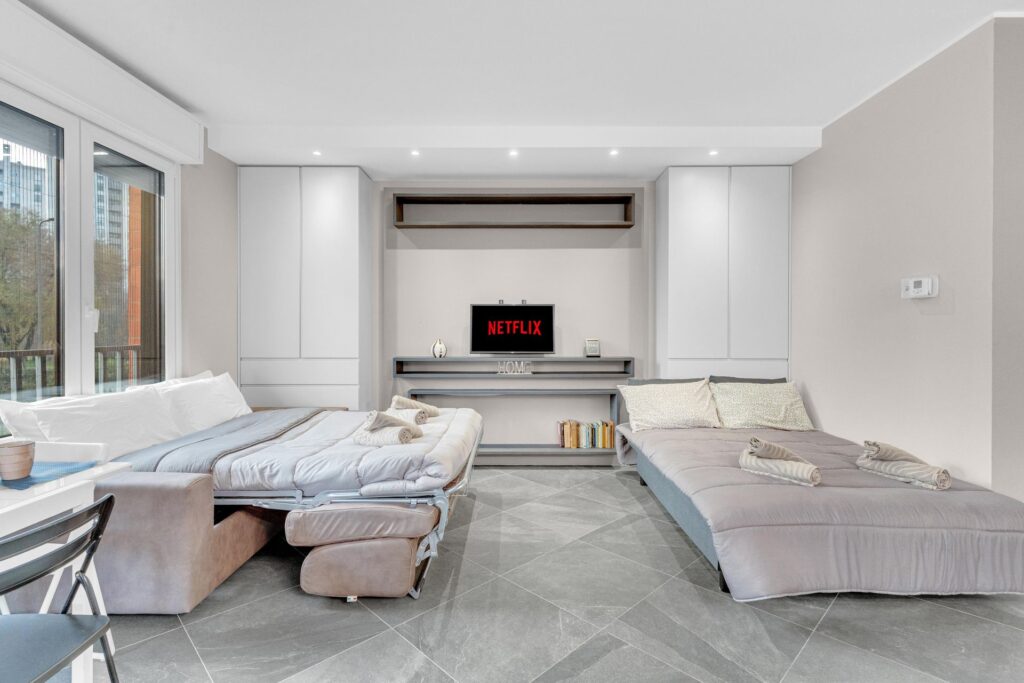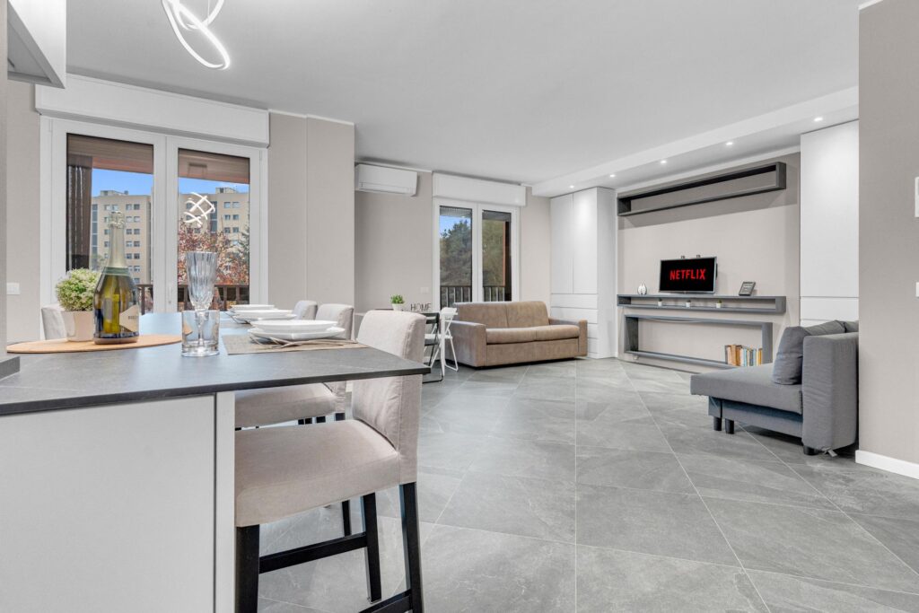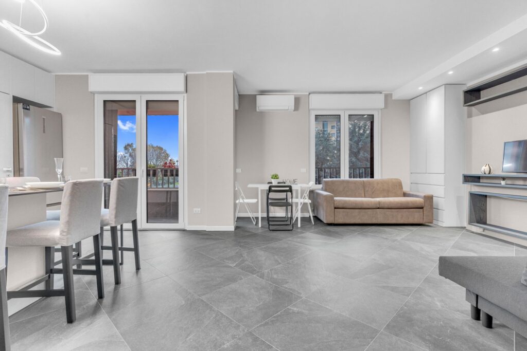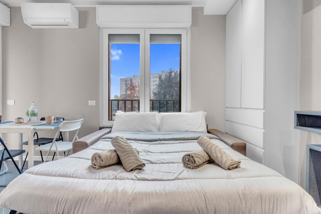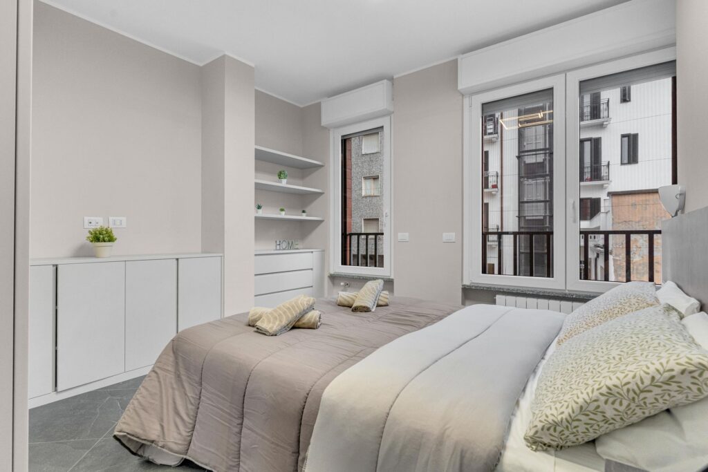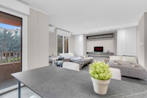 Gli spazi sono sfruttati in ogni dettaglio:l’arredo è su misura e l’immobile è composto da ingresso nel ampio soggiorno con cucina a vista che da accesso al balcone, un primo bagno finestrato e ripostiglio. La zona notte è composta da due camere, di cui una matrimoniale dotata di ampia cabina armadio e bagno privato.
