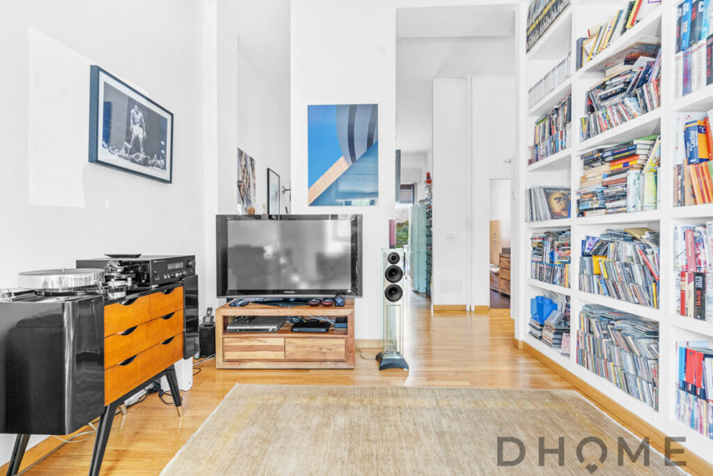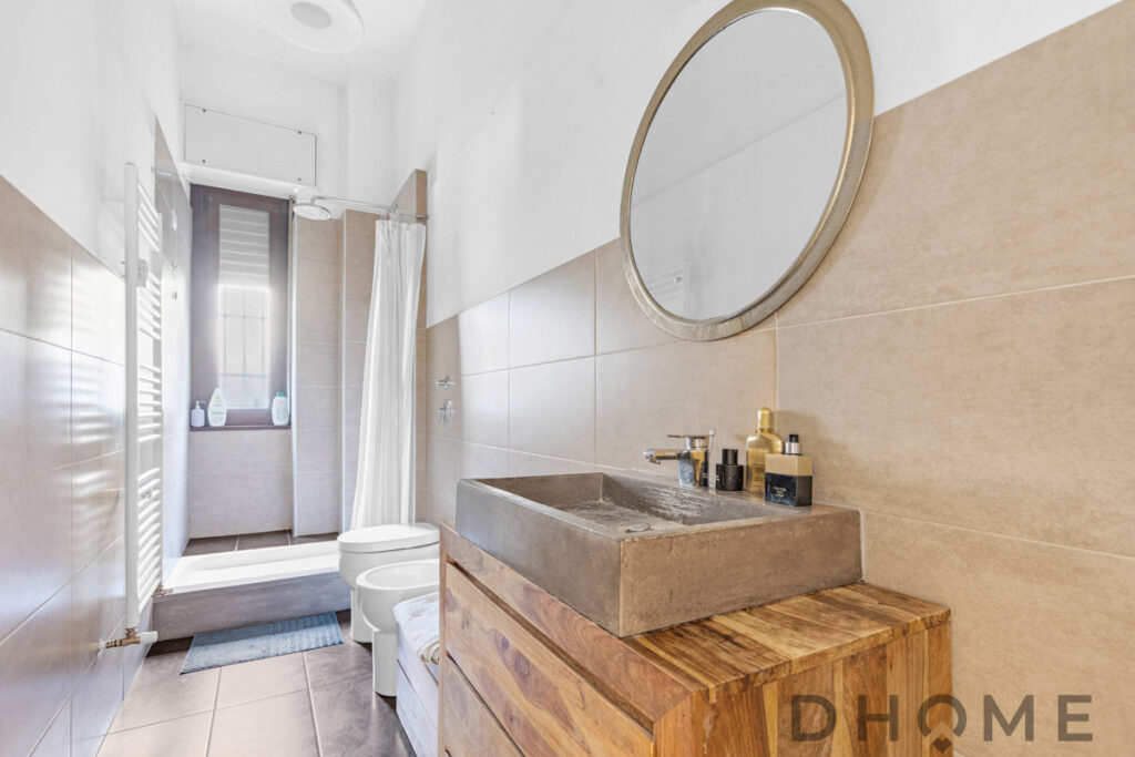 Proseguendo, si accede all’ampia zona giorno composta da soggiorno e cucina, ambienti comunicanti e ben distribuiti, con accesso diretto al terrazzo privato. Il corridoio conduce anche al bagno padronale, finestrato, rifinito con gusto, completo di box doccia, lavabo in pietra naturale e pavimentazione in ceramica.