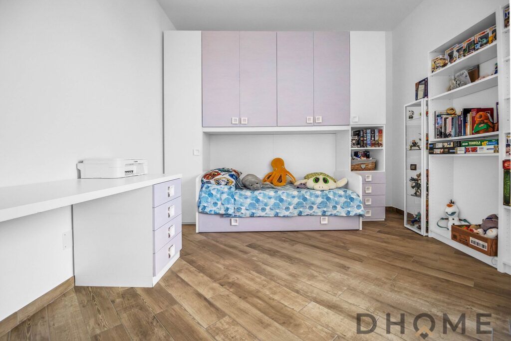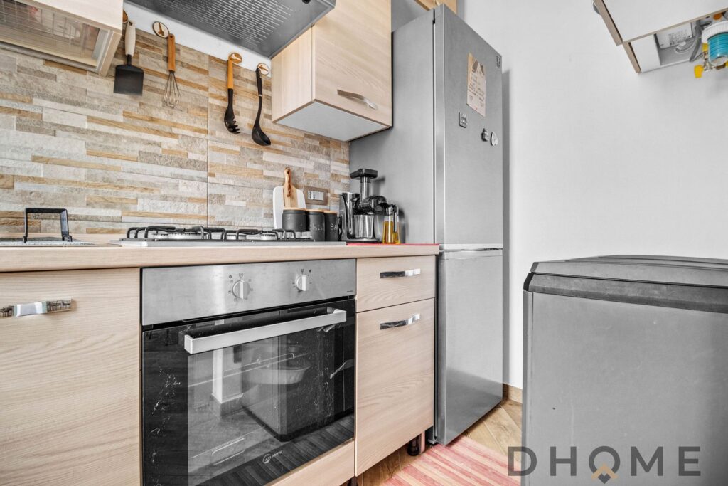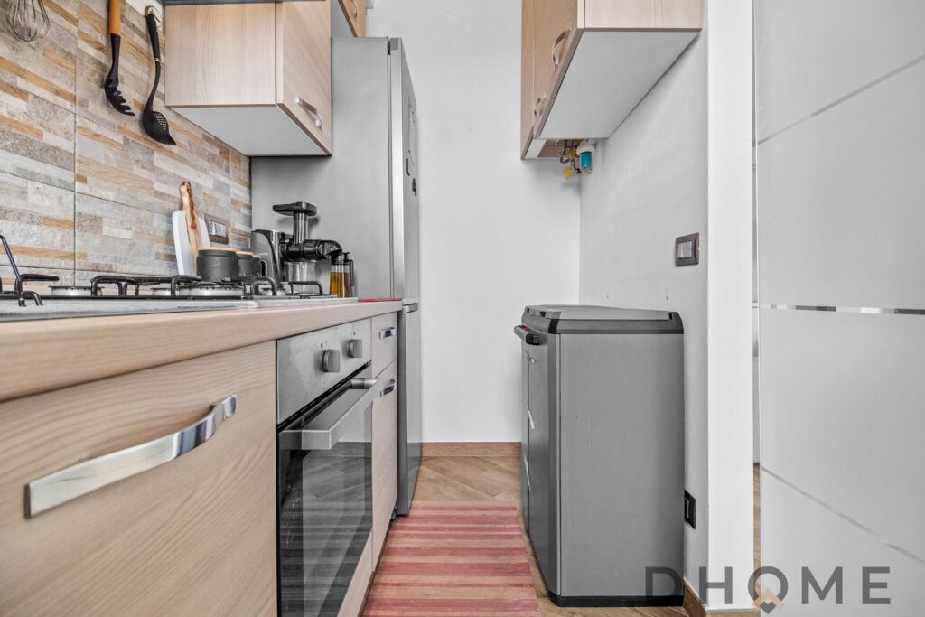 Il soggiorno gode di un piacevole balcone con affaccio arioso, perfetto per un momento all’aperto; una porta a vetri separa l’angolo cottura finestrato, mantenendo la comodità di uno spazio funzionale ma ben distinto dalla zona living. Dal disimpegno si accede alle due camere matrimoniali — una attualmente organizzata come cameretta — e al bagno finestrato, rifinito con un ampio piatto doccia moderno.