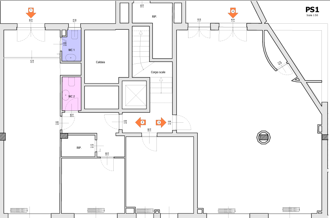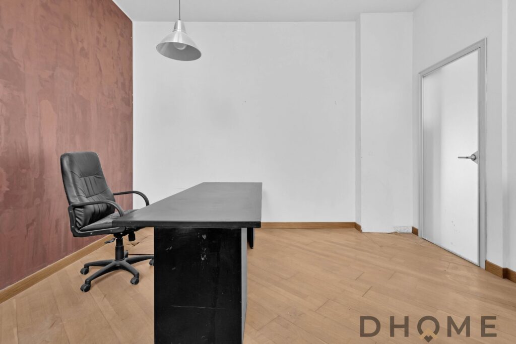 La parte finale dell’ufficio si sviluppa in lunghezza, con una stanza molto ampia dalla forma rettangolare, ideale per uso direzionale o come spazio operativo esteso. L’ambiente dispone di doppio ingresso, un vantaggio concreto per chi necessita di percorsi separati o accessi indipendenti. In questa zona è presente anche un secondo bagno e un disimpegno utile all’organizzazione degli spazi.