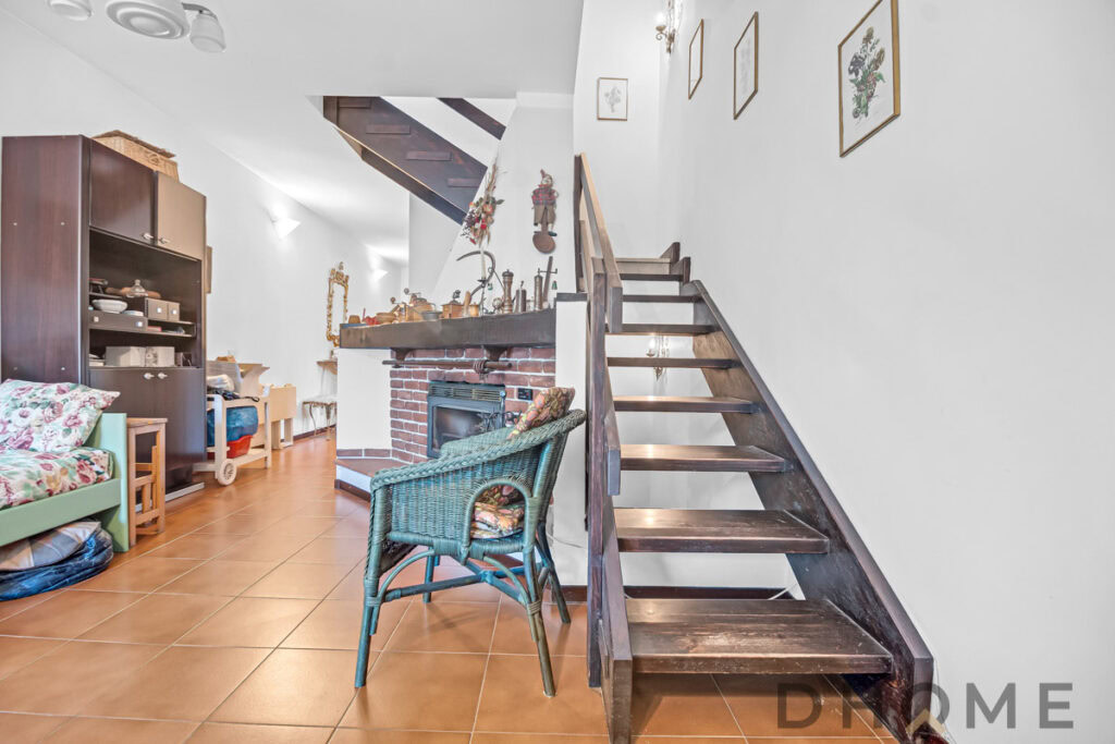 Al piano terra troviamo un accogliente ingresso con corridoio, cucina abitabile, ampio soggiorno con caminetto ideale per le serate in famiglia, bagno finestrato e accesso al giardino privato recintato. Essendo una porzione di testa, la villetta gode di estrema privacy ed un accesso diretto all’ampio giardino condominiale, perfettamente godibile.