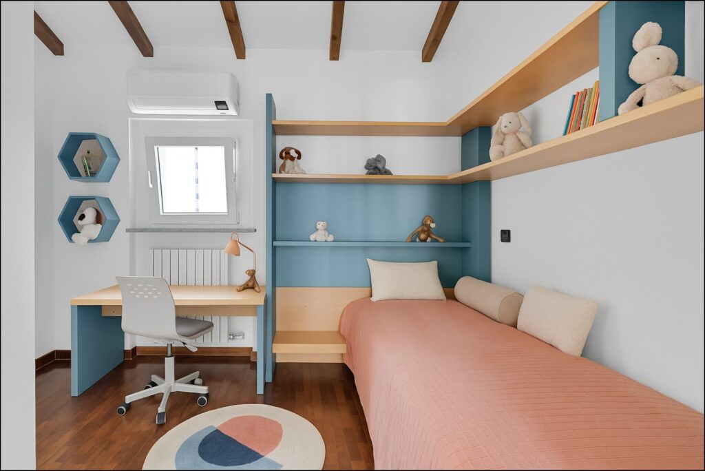 Secondo piano abitabile: due camerette, una con accesso al balcone, cabina armadio e ampio bagno con doccia walk-in.